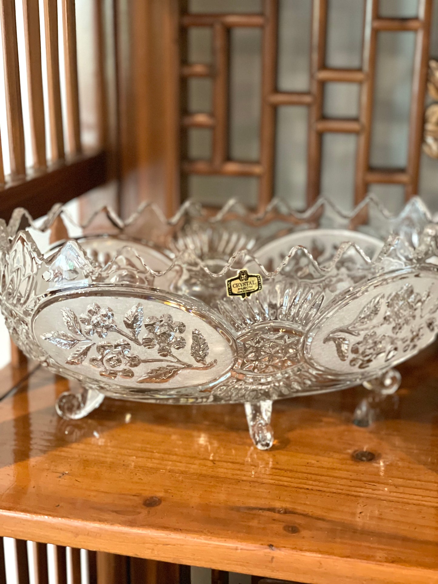 Vintage Lead Crystal Frosted Footed Oval Bowl