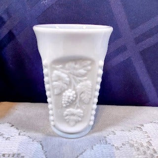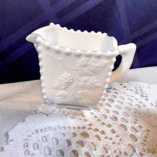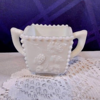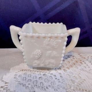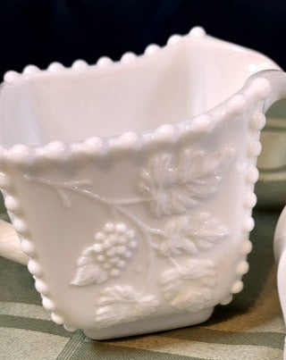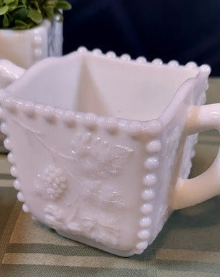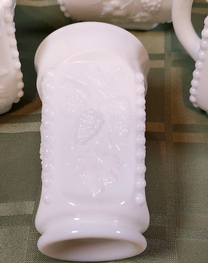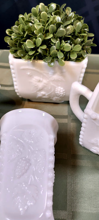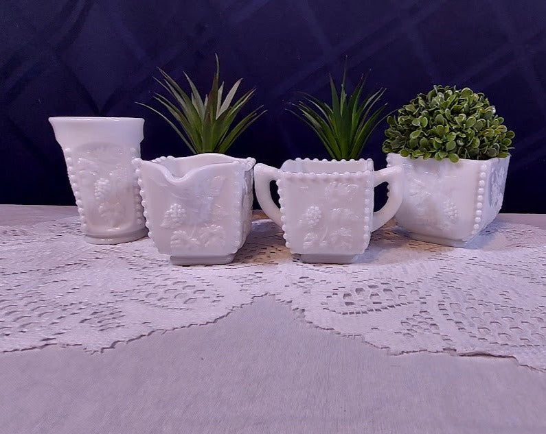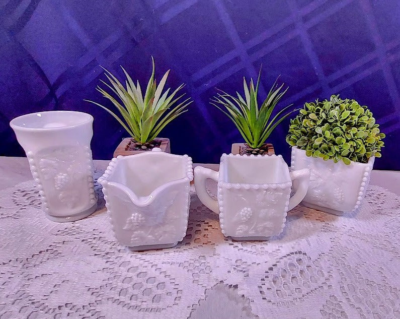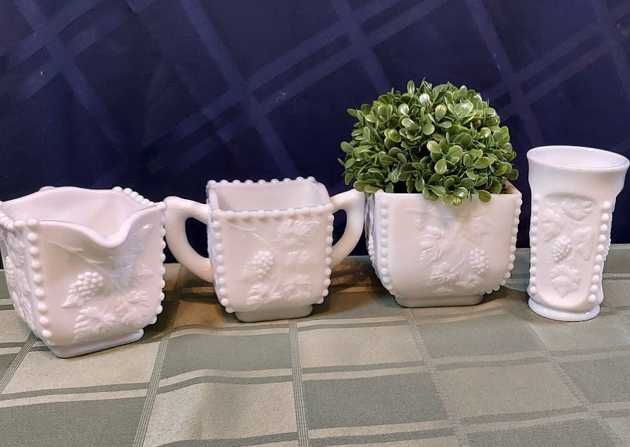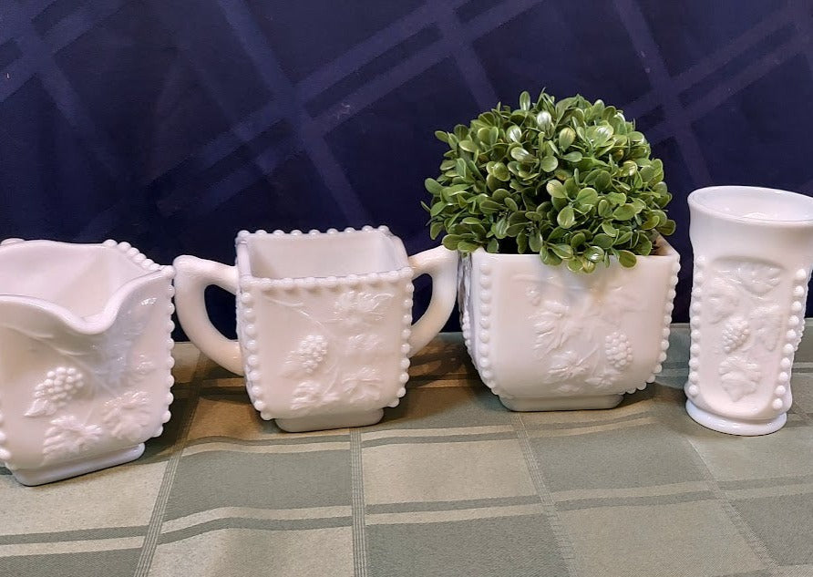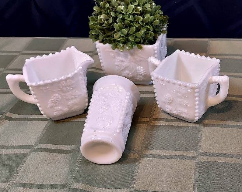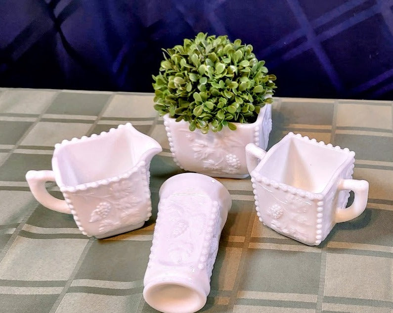 Add a touch of vintage elegance to your home with this set of 4 Westmoreland milk glass pieces from the 1950s. The set includes a creamer, open sugar, small planter, and vase/tumbler, all featuring a beautiful grapevine design with beaded sides. In excellent condition with no chips, cracks, or repairs, this set is a perfect addition to any collection.
