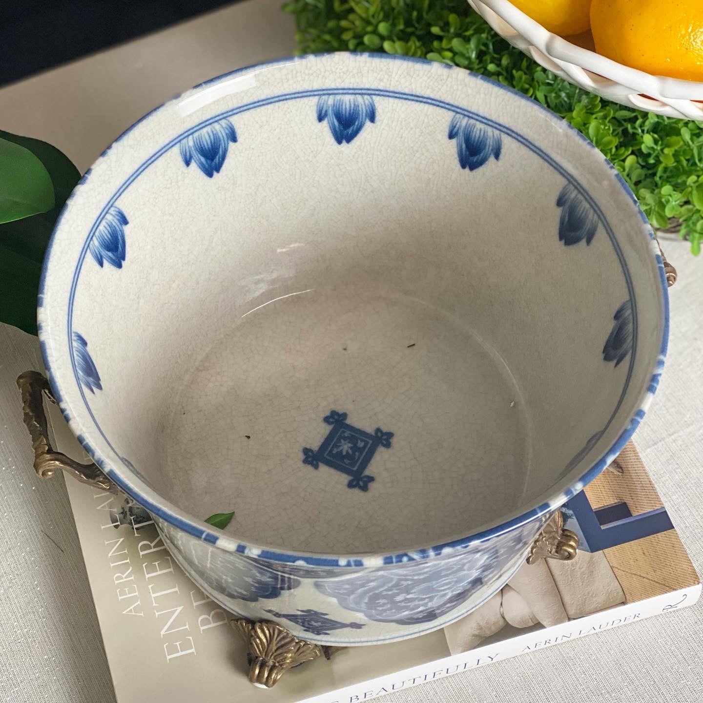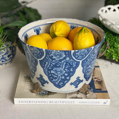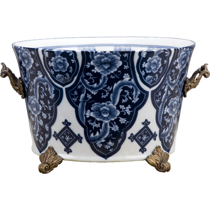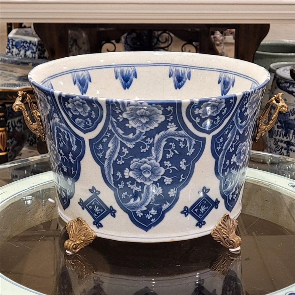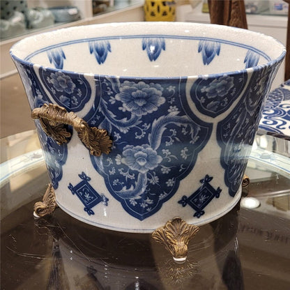 Danny's Fine Porcelain - 12L X 10.5W X 7H Porcelain Bowl Planter in Blue & White W/ intricate bronze handles