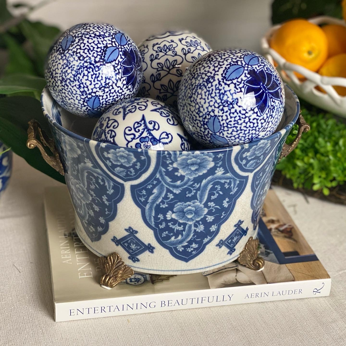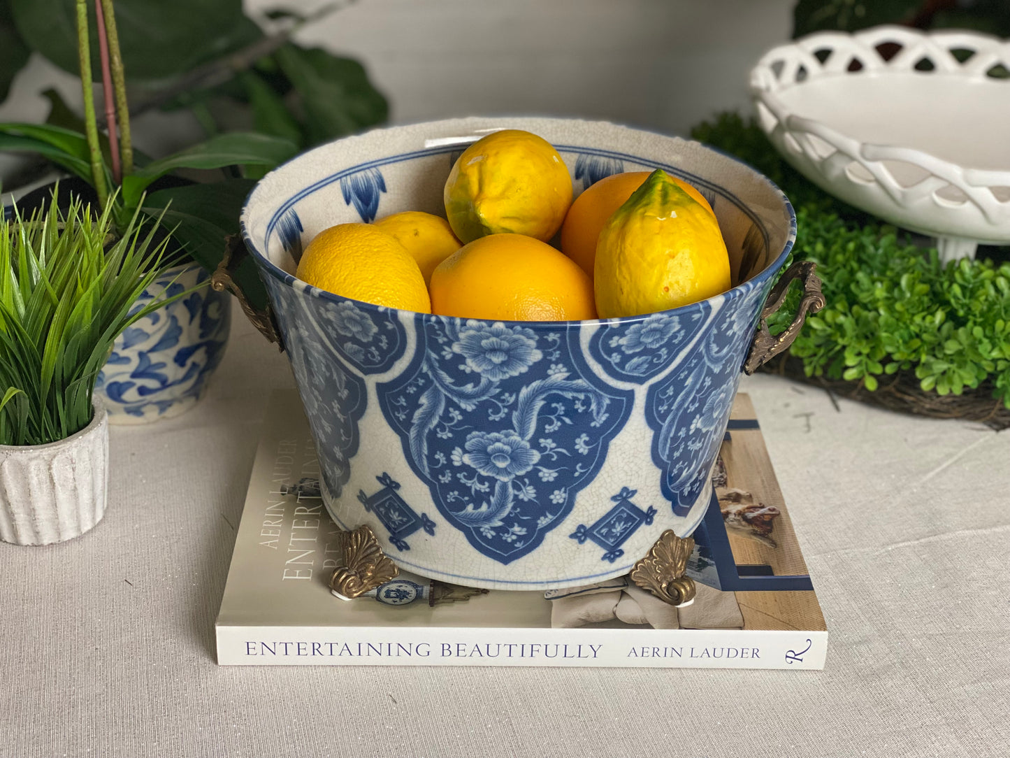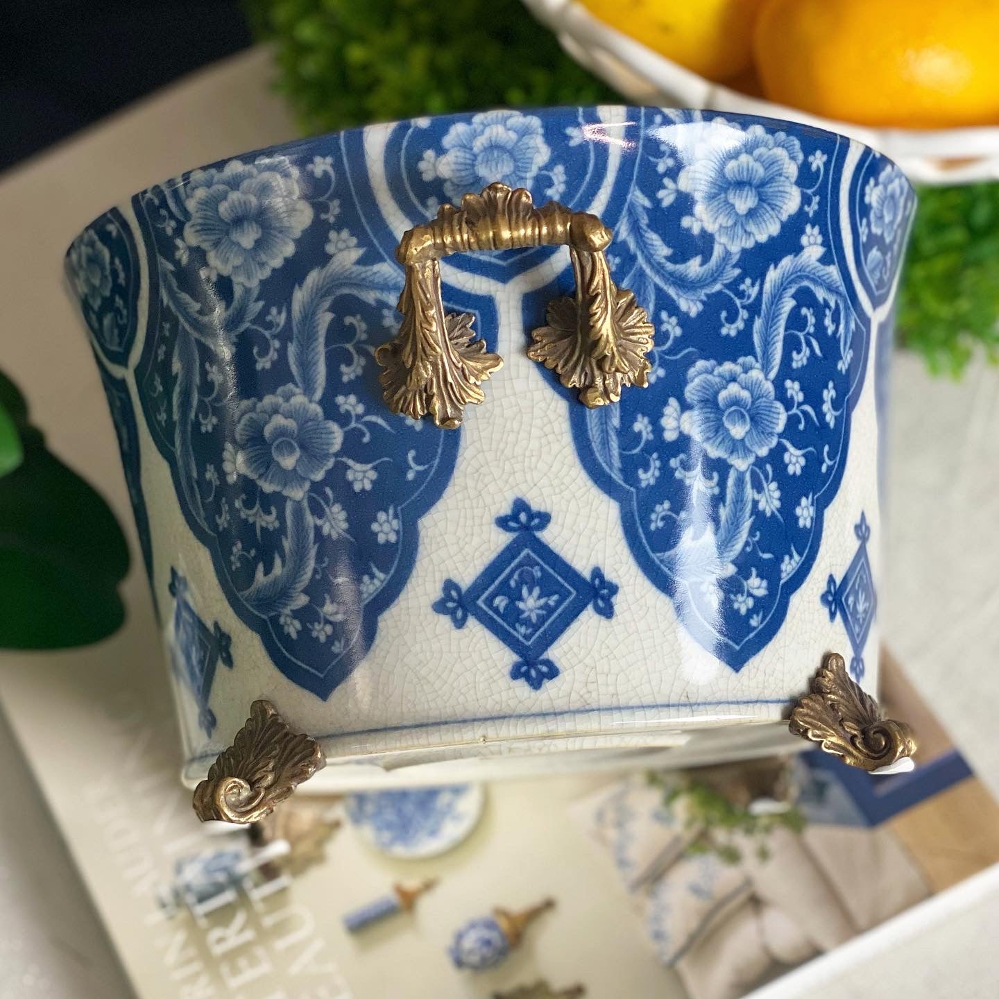 Danny's Fine Porcelain - 12L X 10.5W X 7H Porcelain Bowl Planter in Blue & White W/ intricate bronze handles