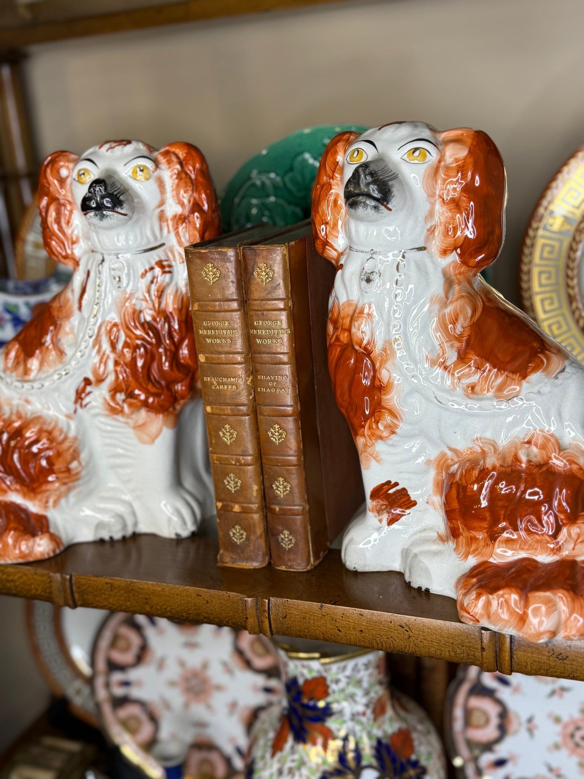 Hand-painted in a rich red and white palette, these seated spaniels feature expressive faces, gilded collars, and beautifully modeled coats with that signature high-gloss glaze that defines early Staffordshire figures. Their scale makes them particularly impactful—substantial enough to anchor a shelf, yet classic enough to layer seamlessly into a collected interior.