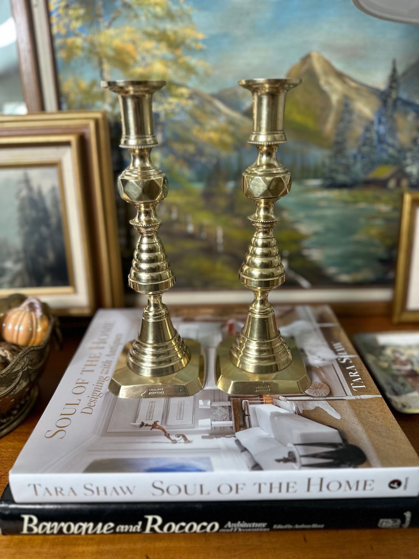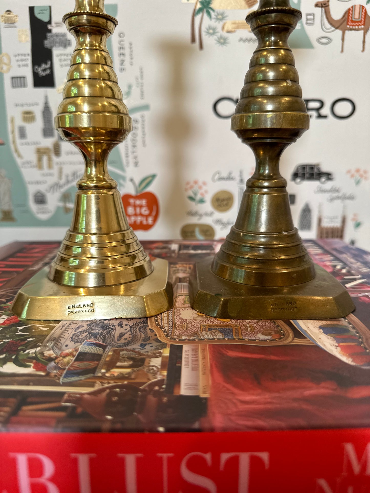 Late 19th Century Victorian Pair of Brass Beehive Candlesticks, Made in England, 9.75”