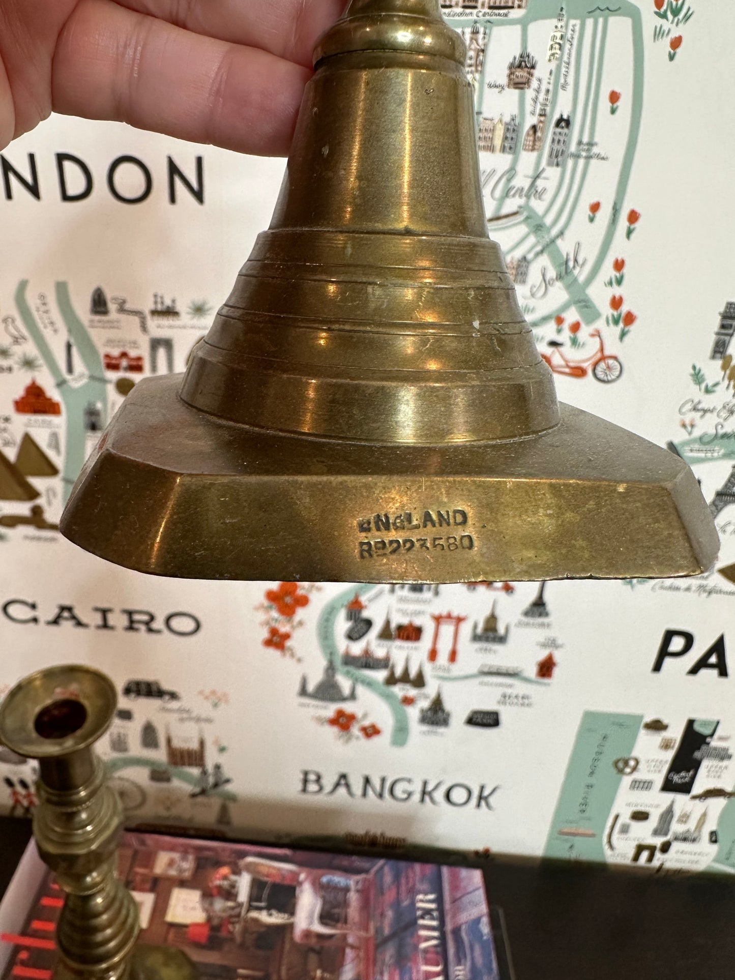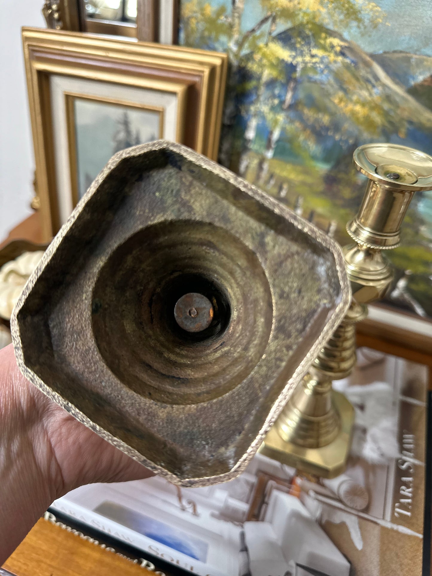 • There is some slight age wear as is expected with a tiny dent on the side of the base of one candlestick; it's hard to see but makes this one rock slightly if touched rather than sitting flush on the surface