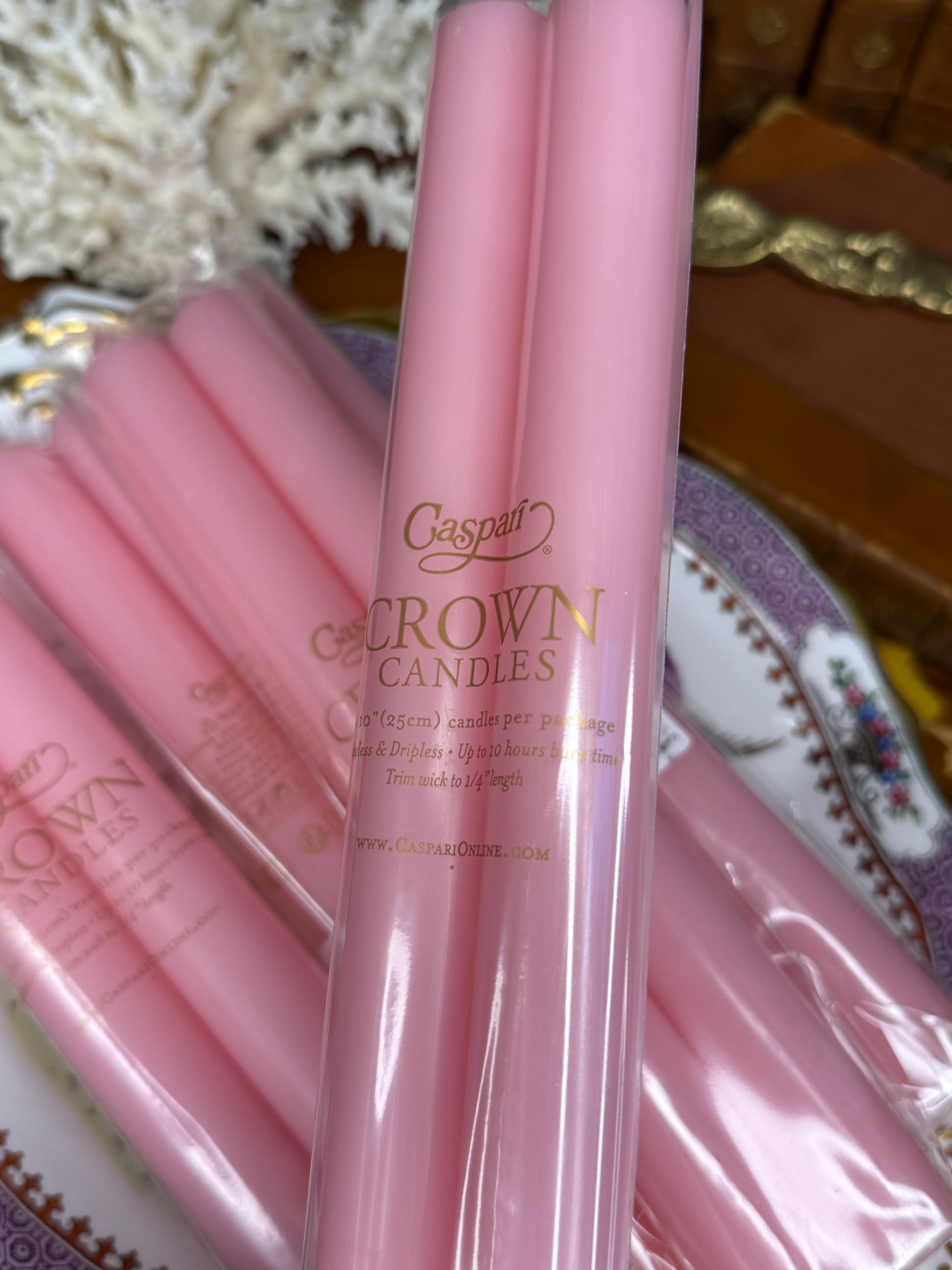 Our elegant 10-inch crown candles are made with a paraffin and palm wax blend. To ensure a clean burn, they feature a lead-free cotton wick. Smokeless and dripless, they can be safely burned from your tabletop to your mantle without worry of a mess. The pairs are available in a variety of beautiful through-colors or metallic finishes. Our assortment that ensures candles are available to coordinate with any Caspari table setting or décor. Effortlessly add warmth and charm to your table when you display any of our crown candles in a standard candlestick or tapered candle holder.