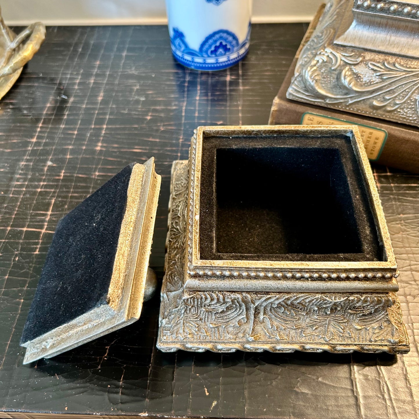Charming silver shade baroque wooded frame box.