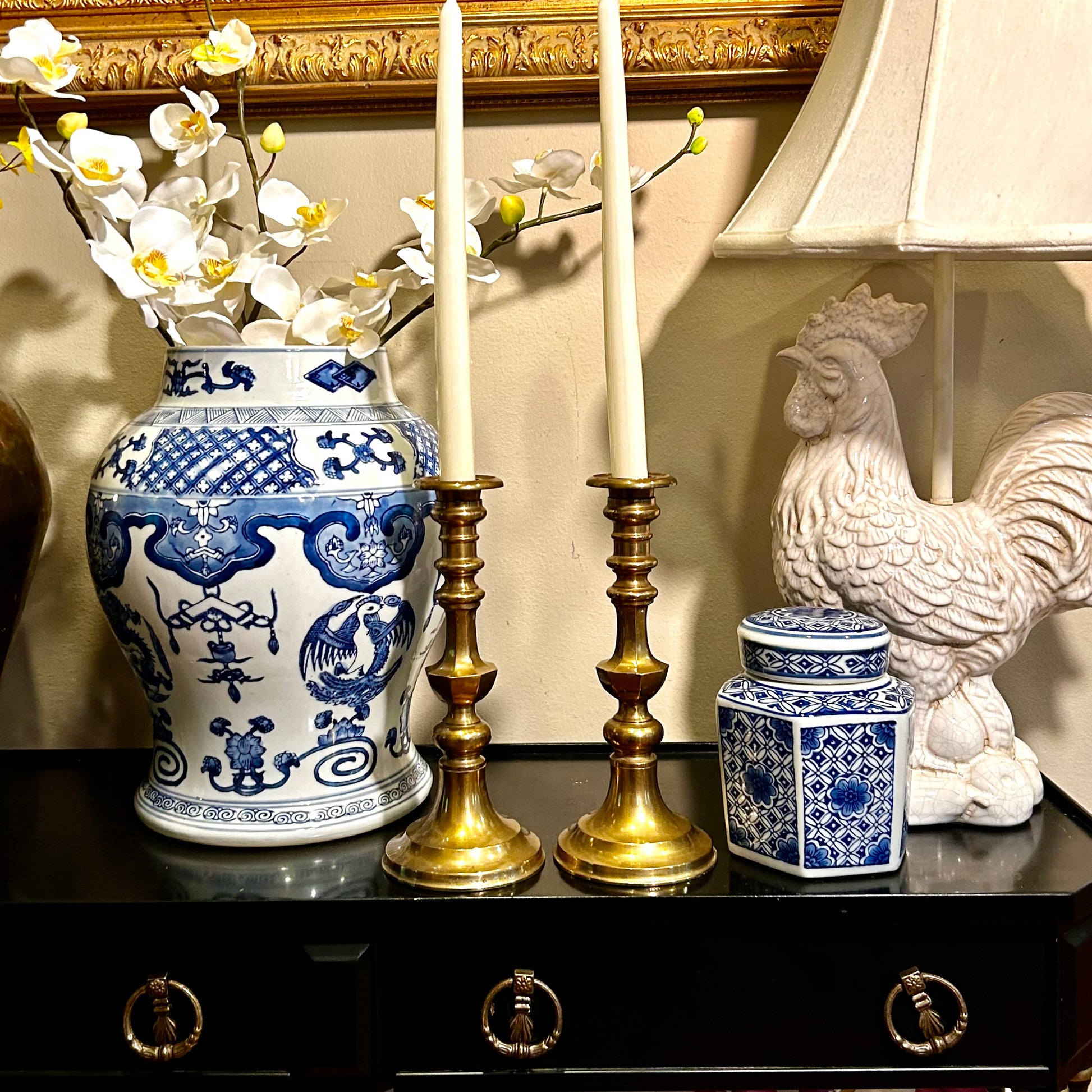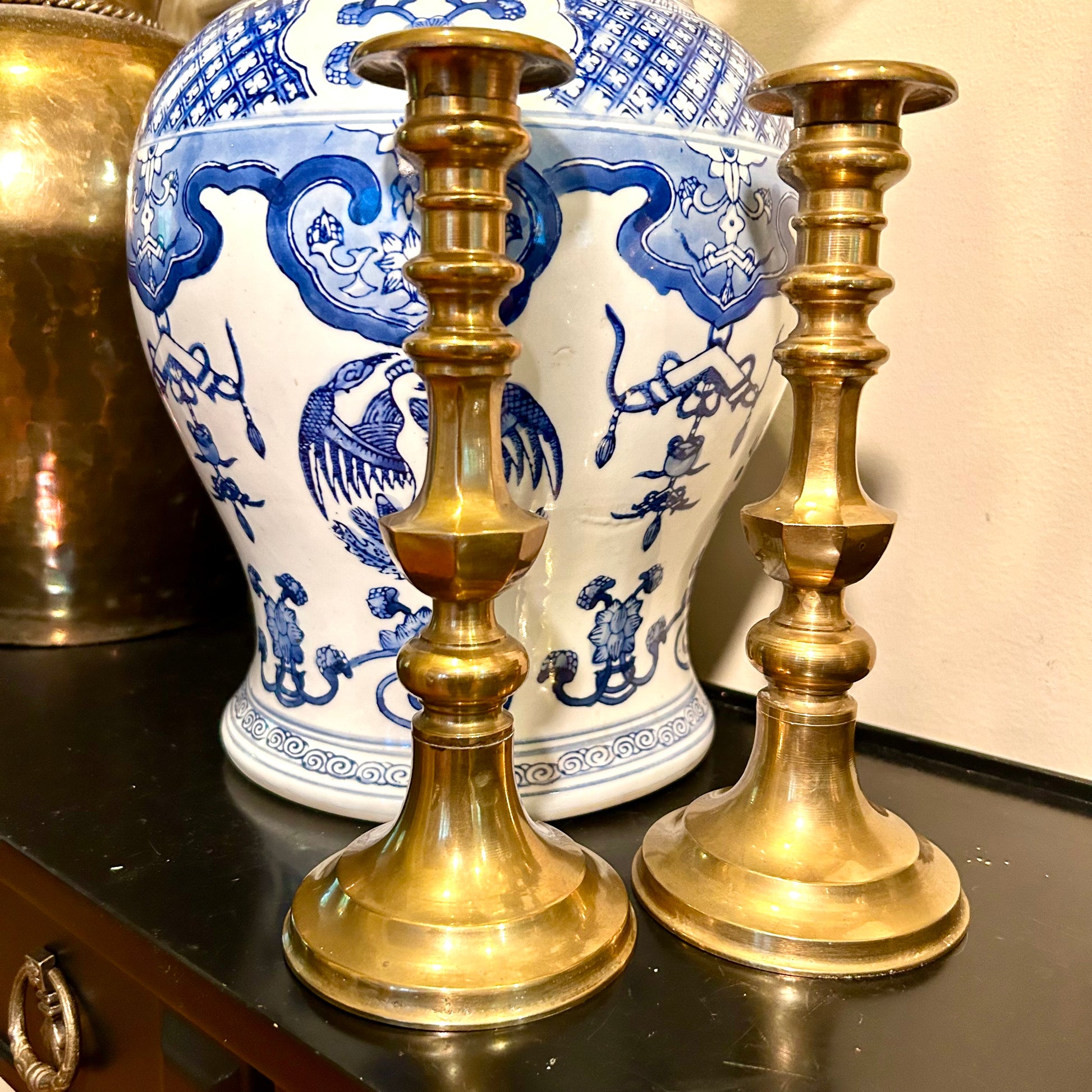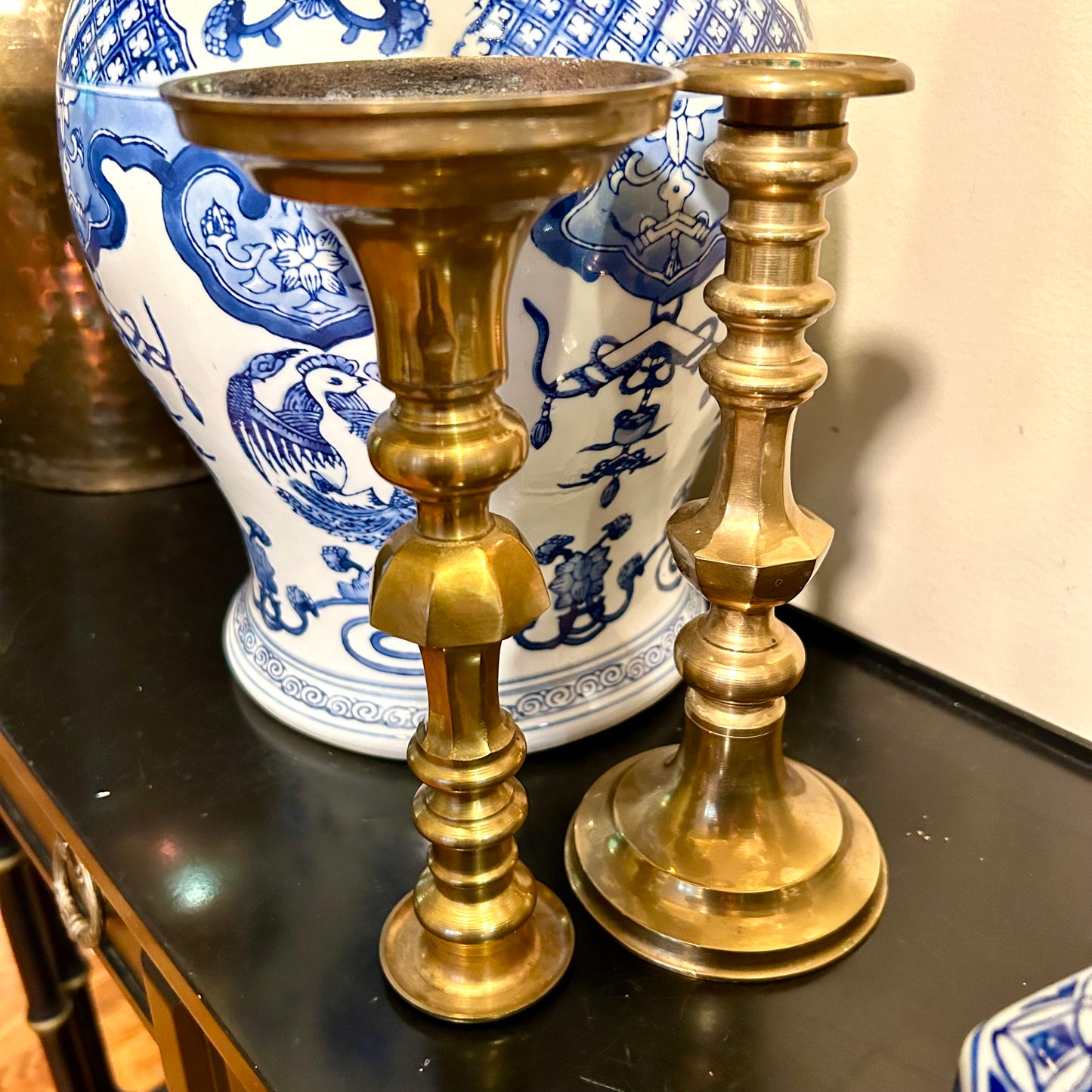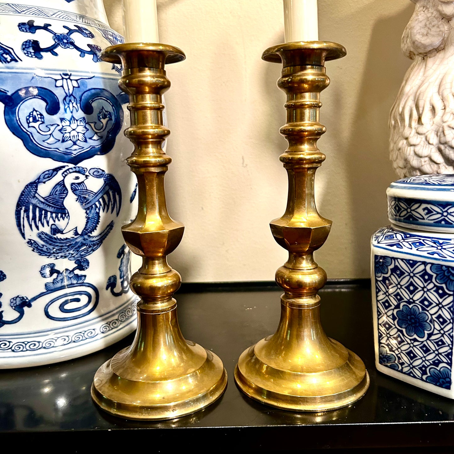 Classic pair of heavy brass candlestick holders . Beautiful matte finish 9 in high