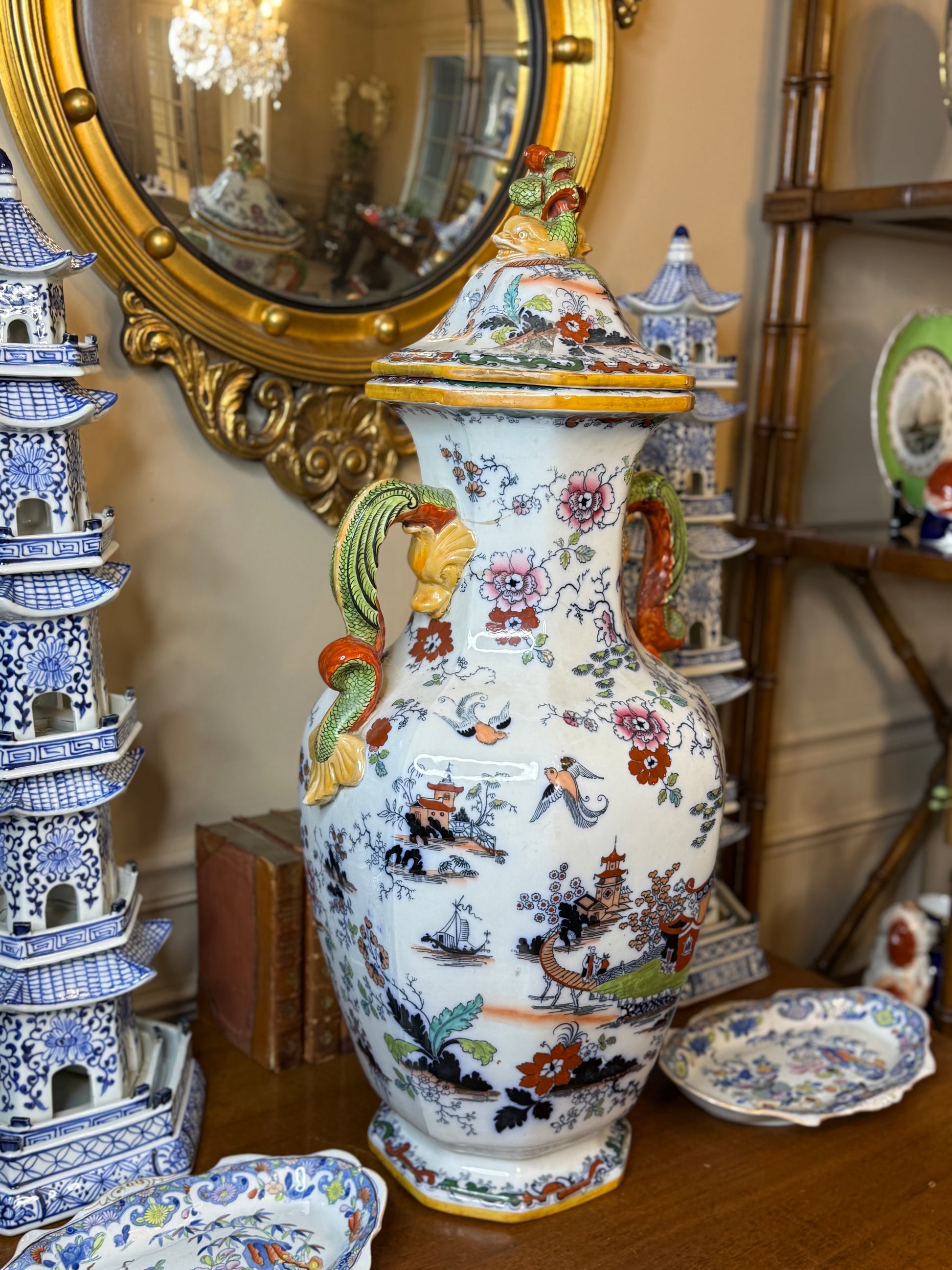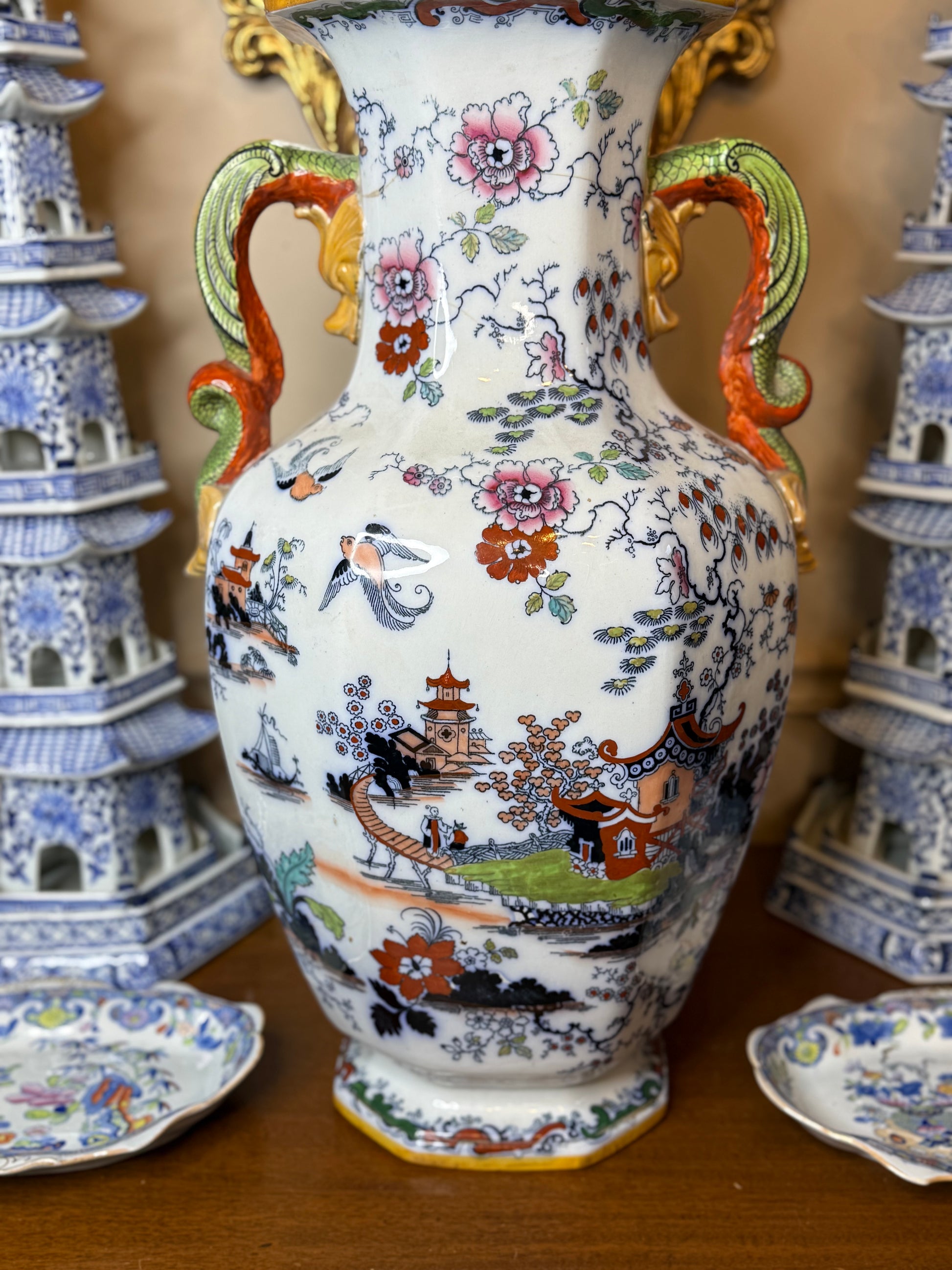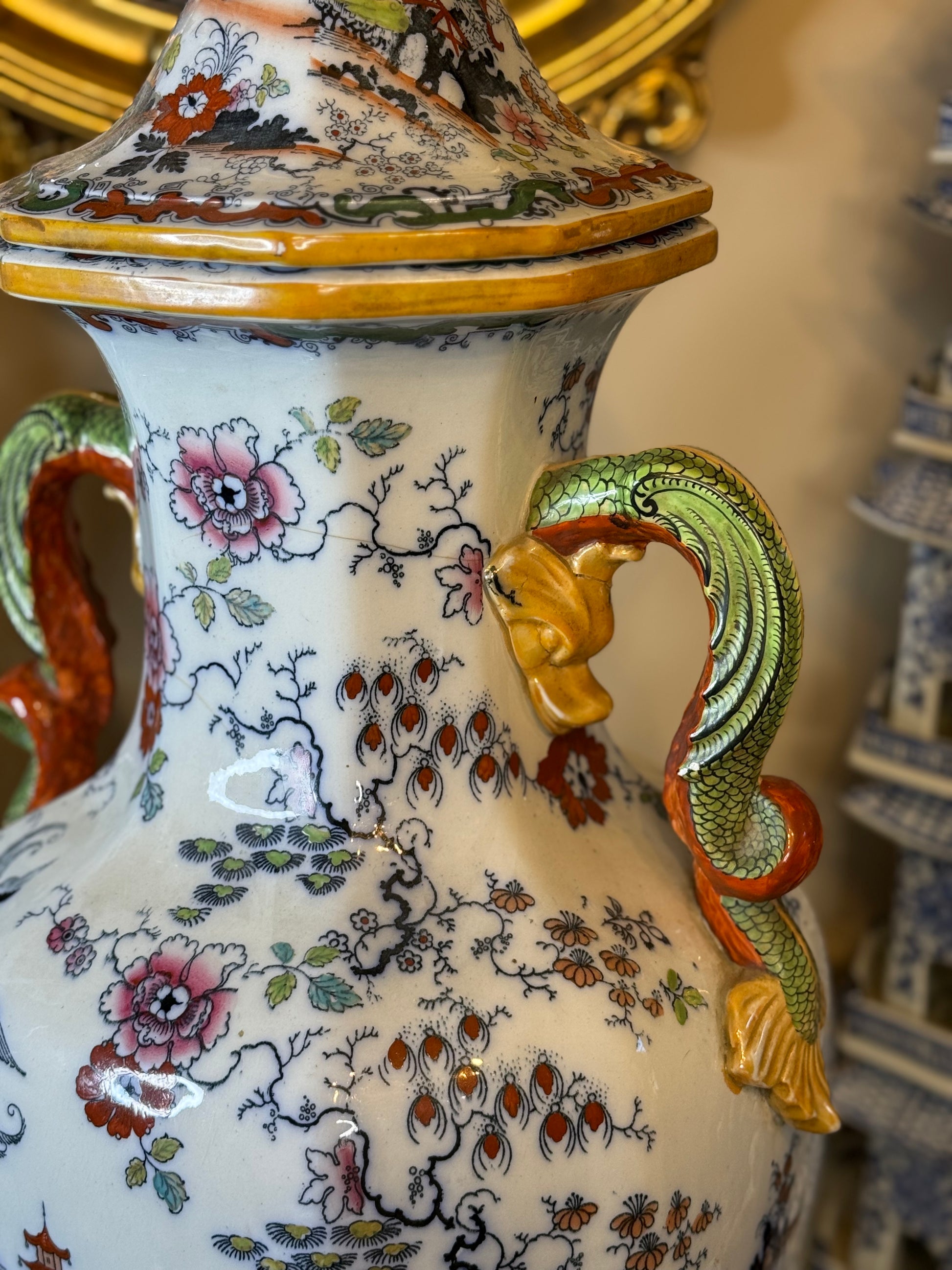 An extraordinary 19th-century Mason’s Ironstone urn of impressive scale, standing an impressive 31” tall with its original fitted lid. This rare piece features a classic Chinoiserie-inspired scene with vibrant hand-painted floral motifs, pagodas, birds in flight, and intricate landscape detailing. The double-handled design showcases ornate dragon-style handles highlighted in rich orange, green, and gold tones, adding a striking touch of grandeur.
