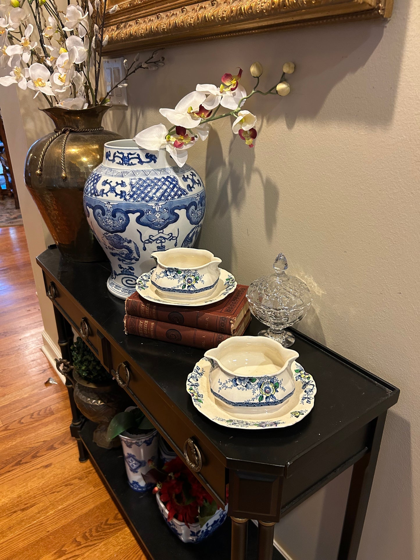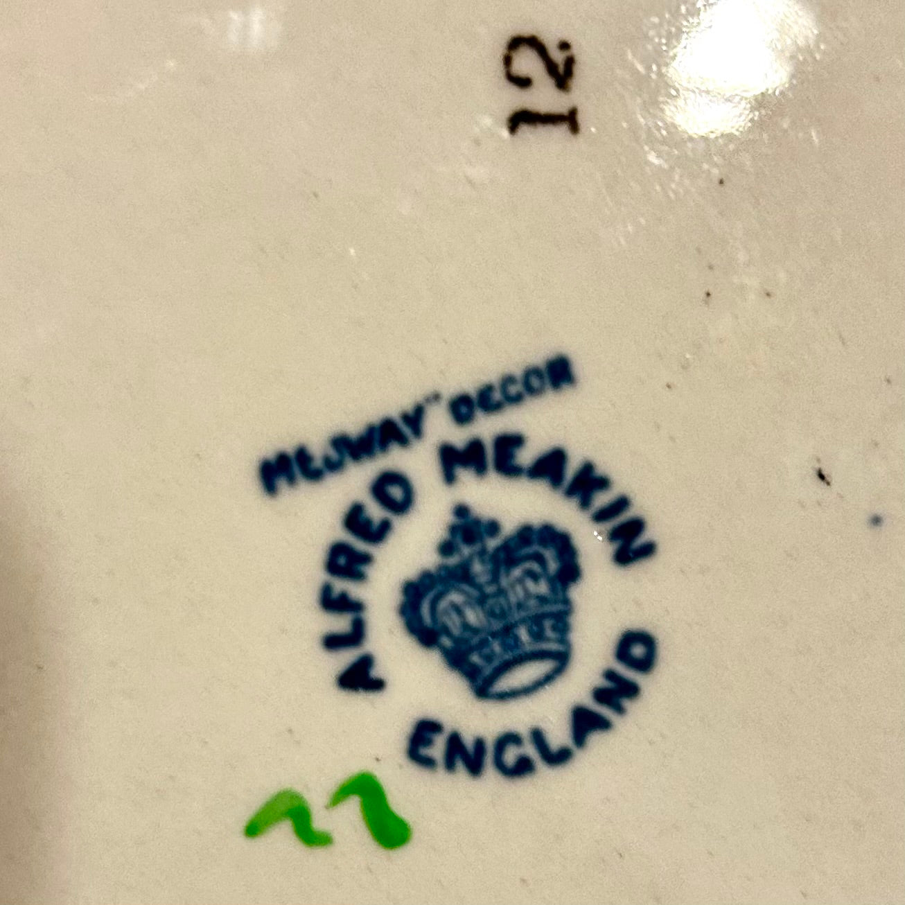 This gravy boat by Alfred Meakin of Staffordshire England is a beautiful and authentic example of antique chinoiserie. Its intricate floral design in blue and white adds a touch of sophistication to your table setting. Carefully crafted and free of any chips, this piece measures 7.5 inches by 7 inches, making it a perfect addition to your collection or a unique gift for any antique lover.