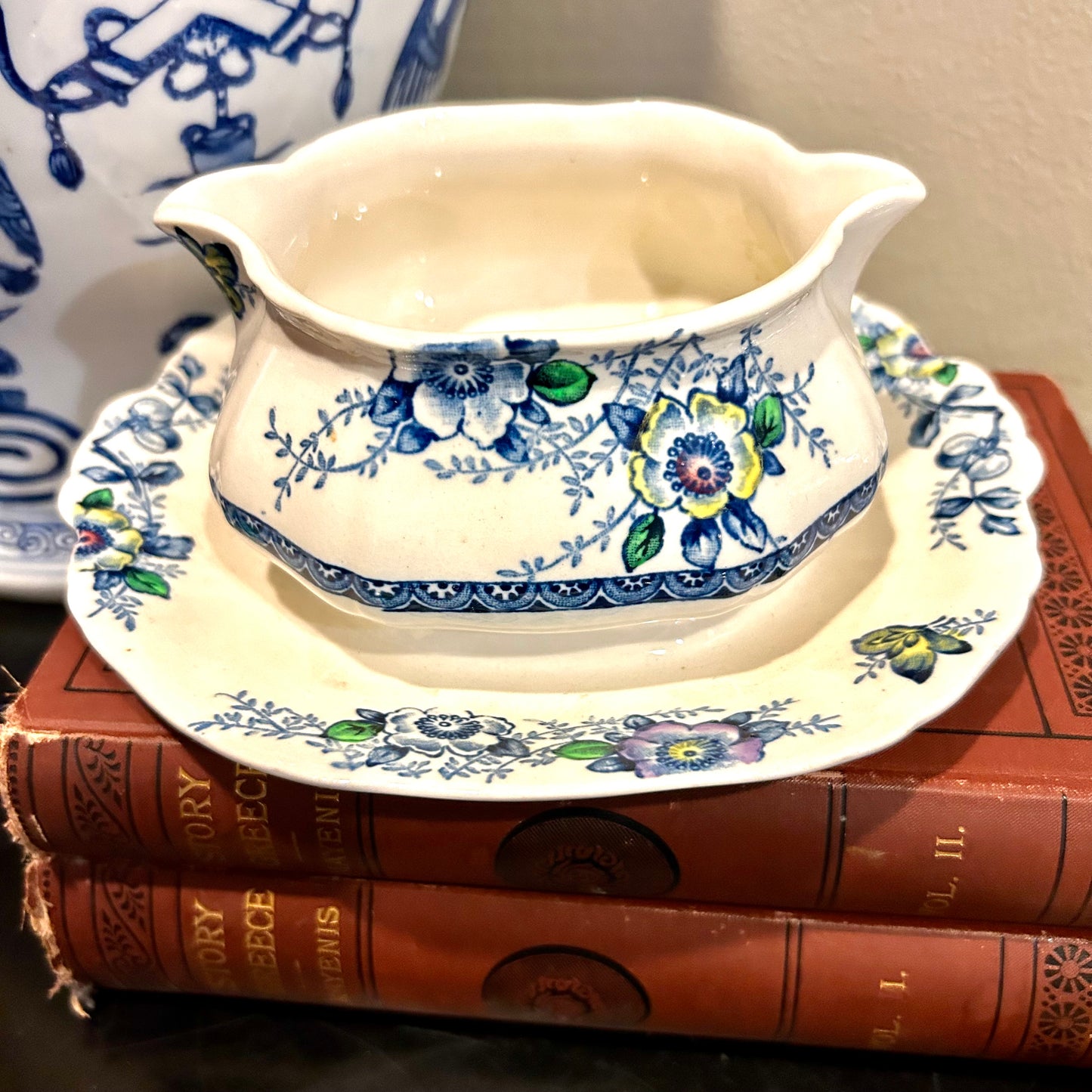 Antique blue & white floral chinoiserie gravy boat by Alfred Meakin Staffordshire England