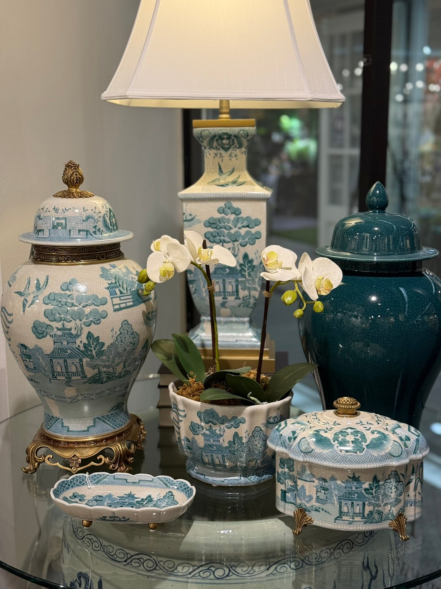 Danny's Fine Porcelain - Black & Which Check Jar W/ Bronze Lid and Shell Handles - 9L X 7W X 10H -