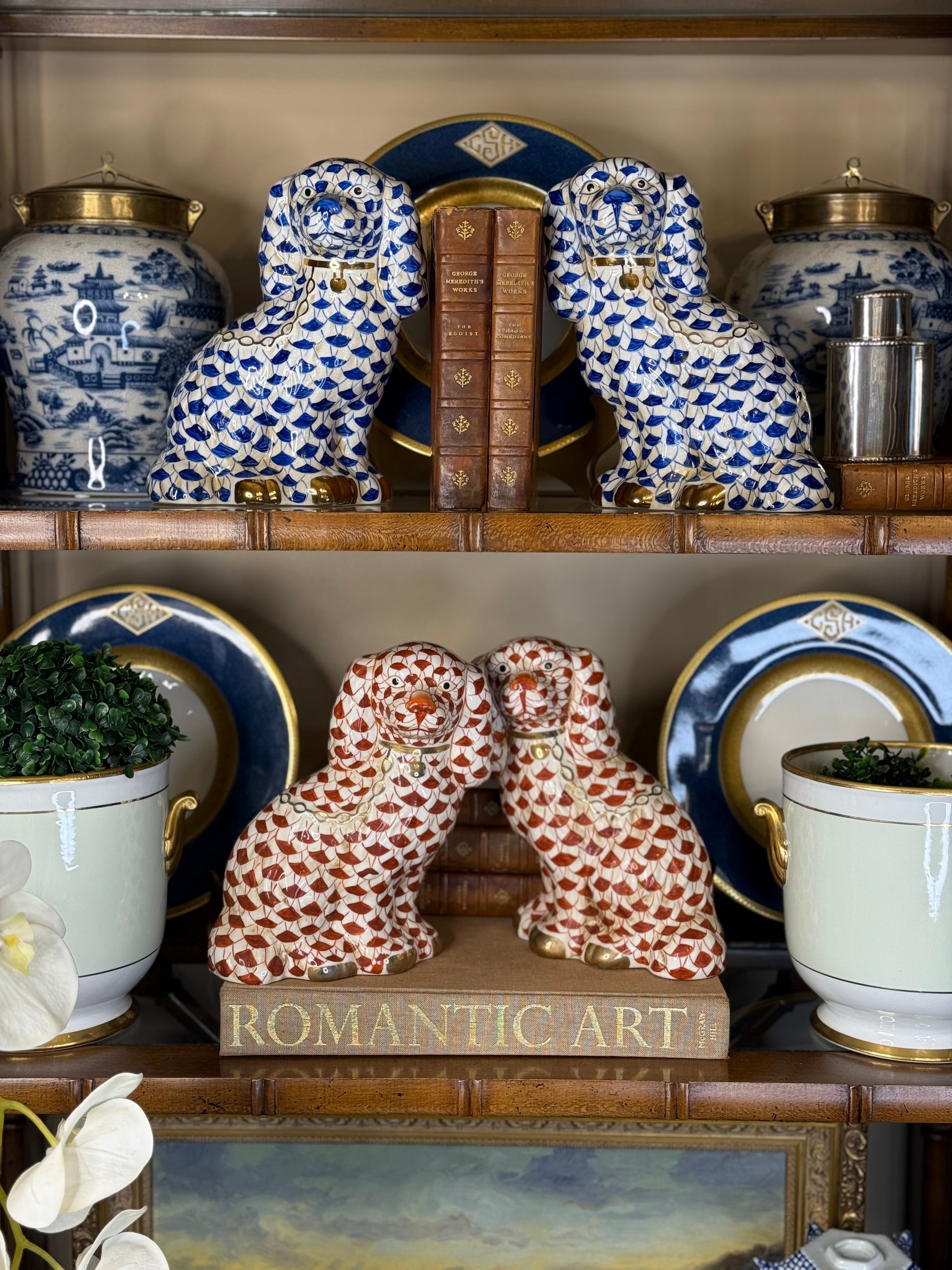 From Danny’s Fine Porcelain, this exquisite pair of Staffordshire-style dog figurines is a decorator’s dream. Hand-painted in a striking Rust and-white fishnet pattern and finished with luxurious gold accents on the collars and paws, these porcelain pups blend timeless English charm with chinoiserie flair.