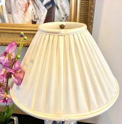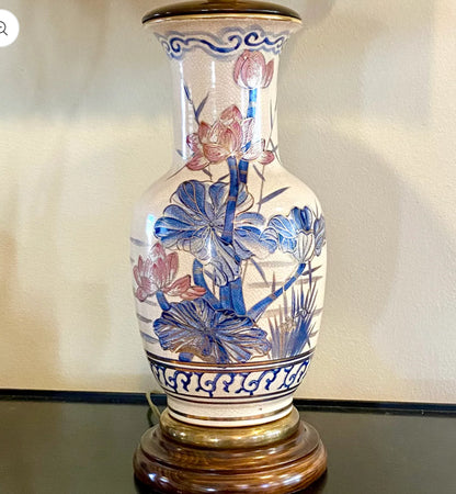 Elevate your decor with this stunning Frederick Cooper vintage porcelain lamp. Adorned with a delicate ivory crackle finish, this ginger jar lamp features a beautiful Chinoiserie botanical design in shades of blue and salmon. The mahogany wood and brass base and topper add a touch of elegance to this timeless piece. Topped with an original ivory pleated shade, this lamp stands at 26 inches tall with a 6-inch diameter base.