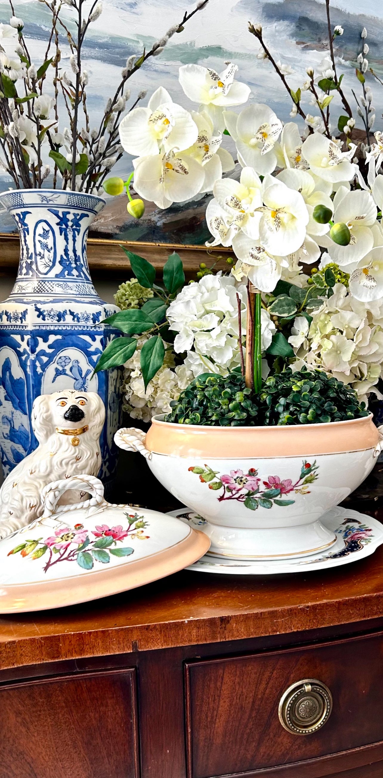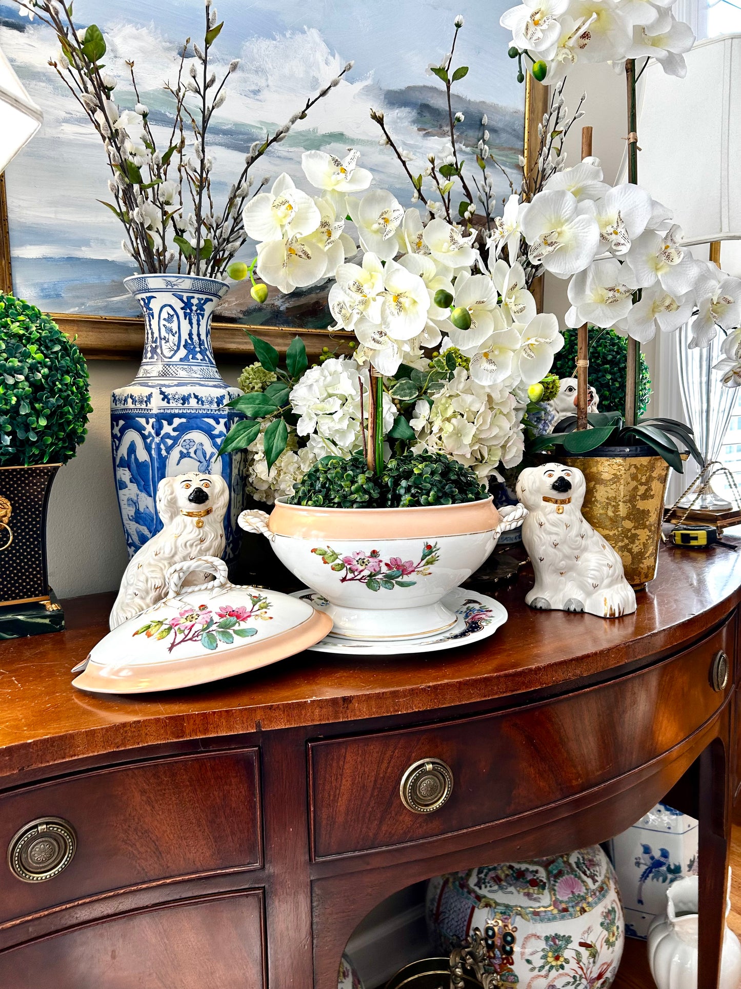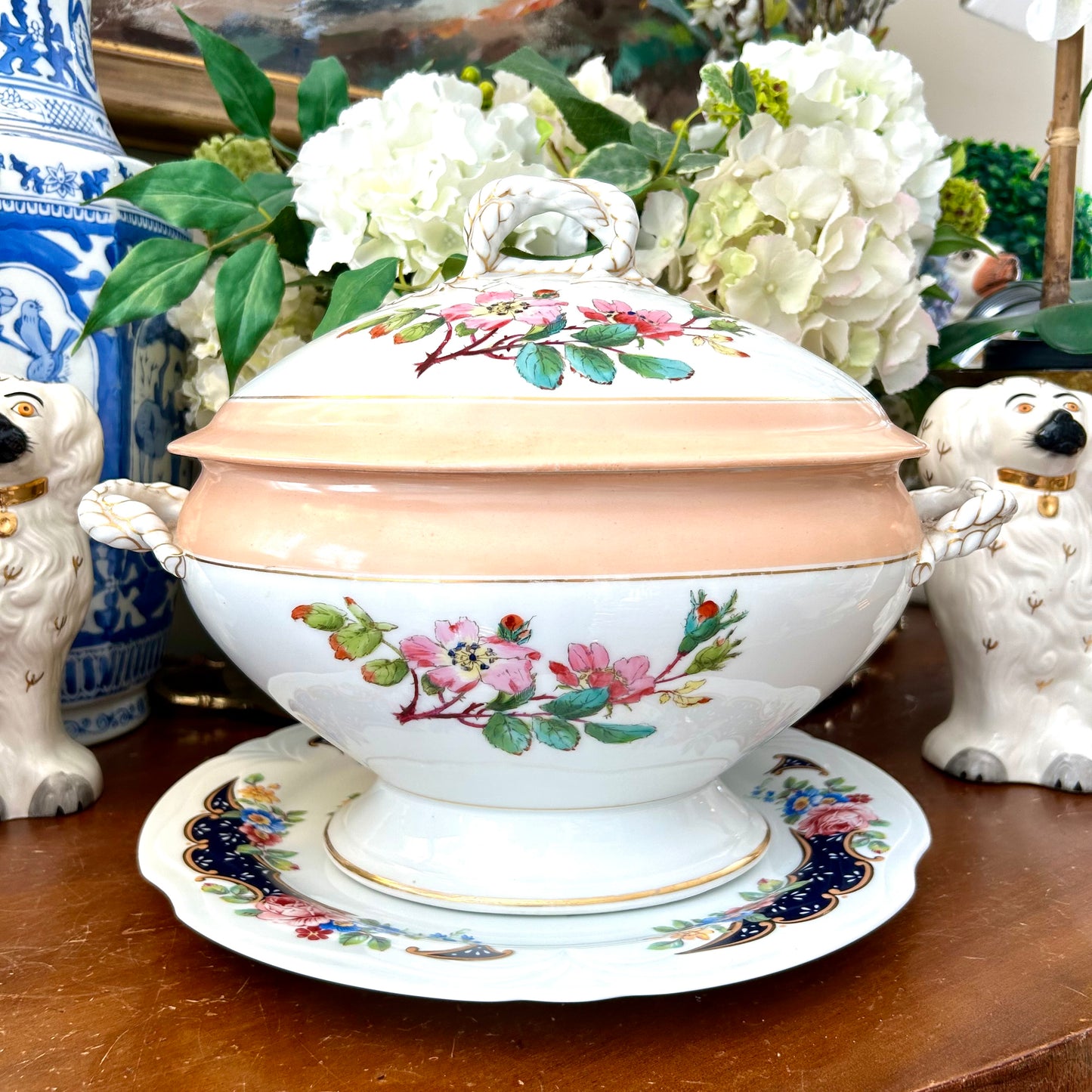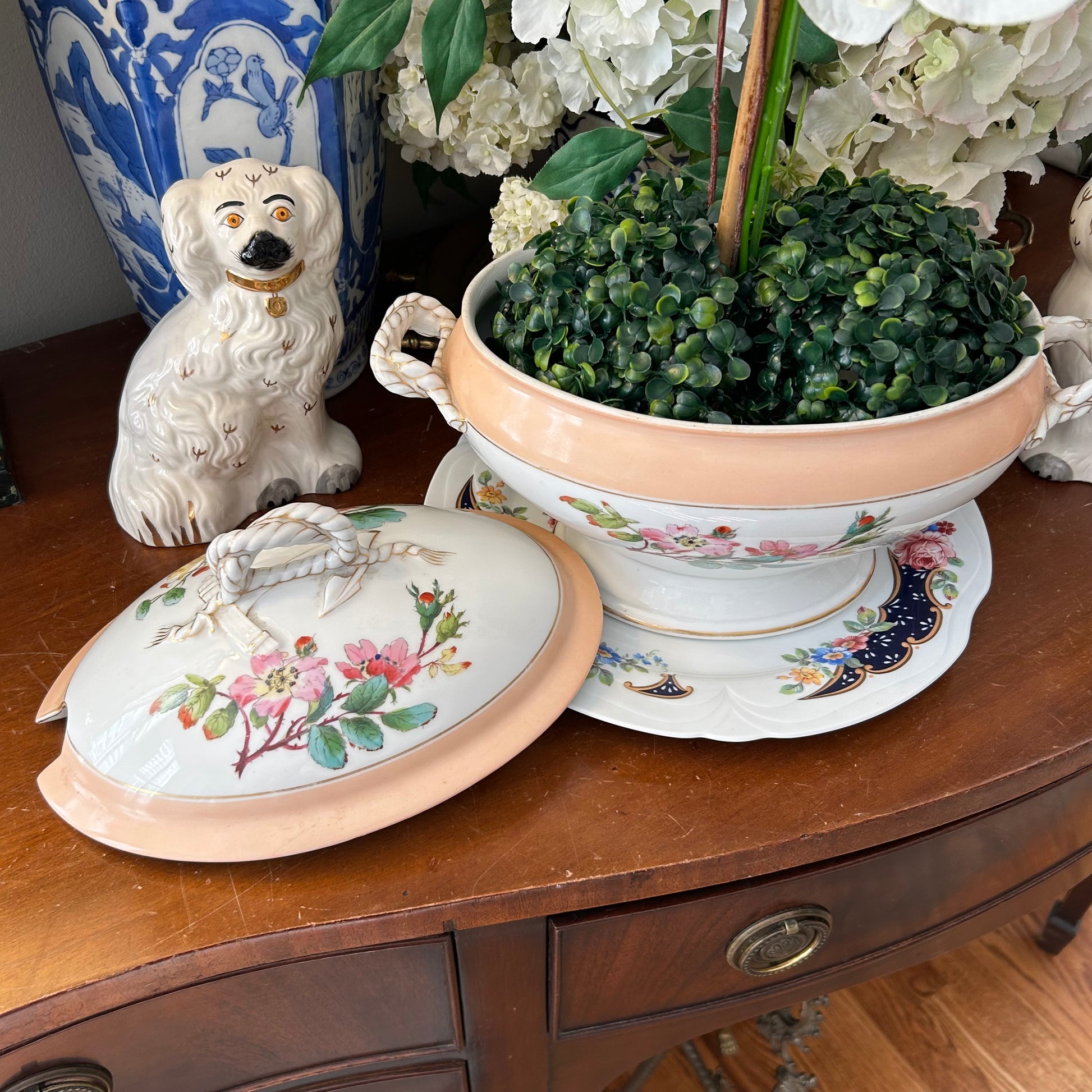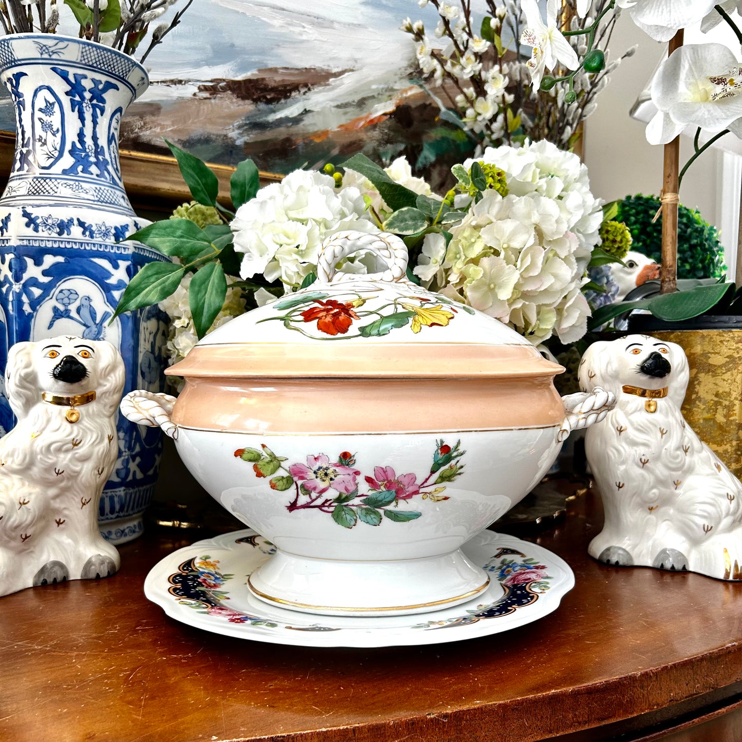 This elegant tureen boasts an exquisite white French porcelain design, adorned with a beautiful brown and gold enameled floral pattern. The rope tassel side handles and anchor top handle add a touch of sophistication. The tureen measures 16 x 11 x 9 and is in excellent condition, free from any chips or cracks. It is clearly marked on the bottom, adding to its authenticity.