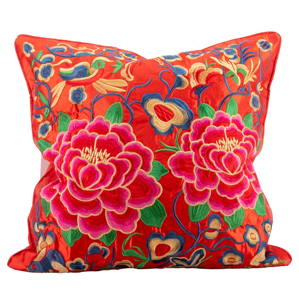 Danny's Fine Porcelain - Pink & Orange, 20x20" Silk Peony Floral, Embroidered Pillow W/ Insert