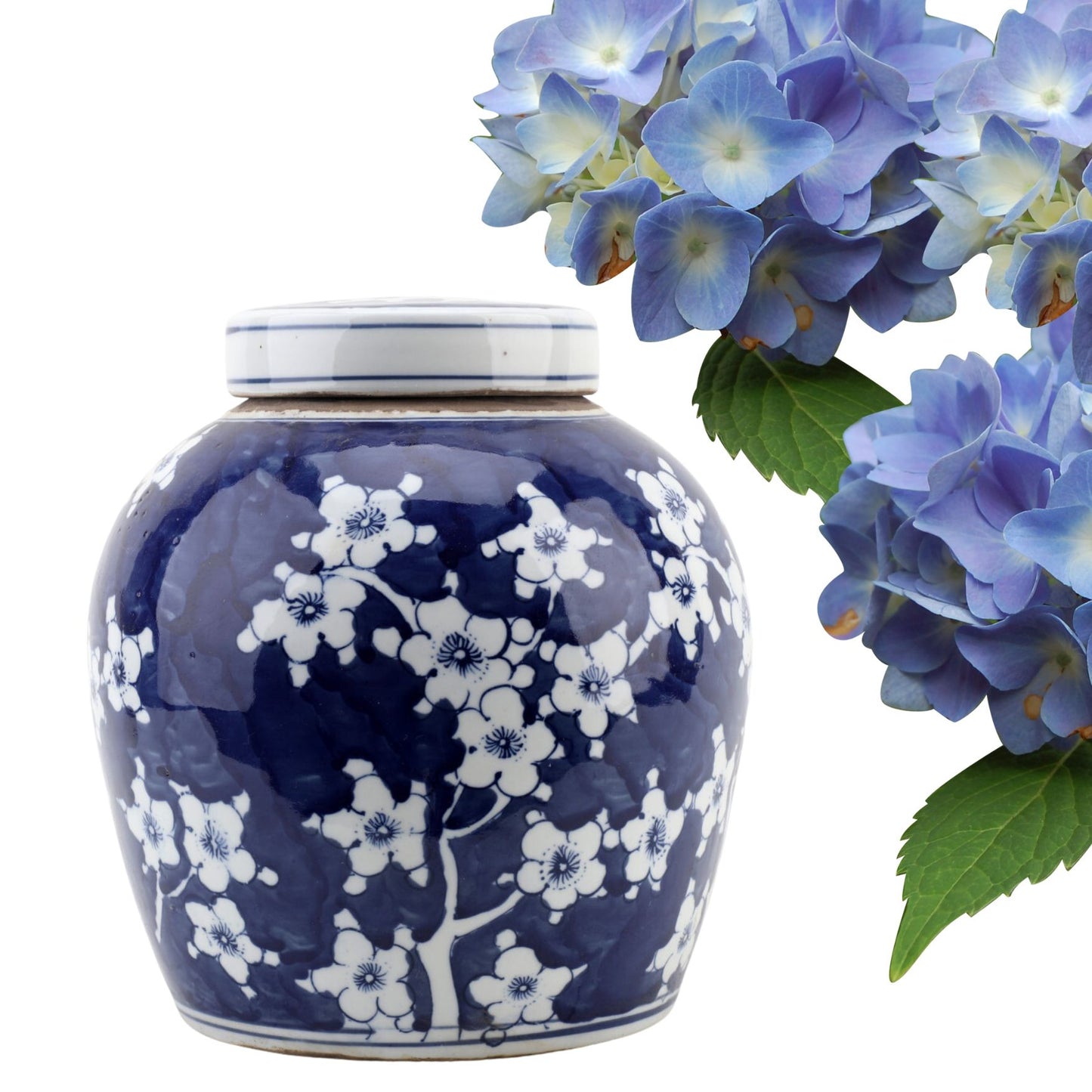 NEW - Blue & White Cherry Blossom Ginger Jar, 9.5" Tall Measures: 9L X 9W X 9.5H, LID: 5 BOT:7".  Looks great as a pair or separate. Sold as a single, shown as a pair for styling. This jar is perfect for adding a little extra style to your living space. Its timeless design makes it the perfect complement to any home decor.