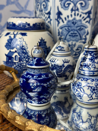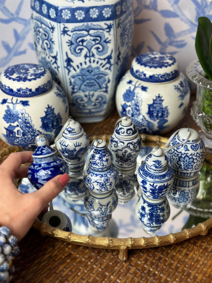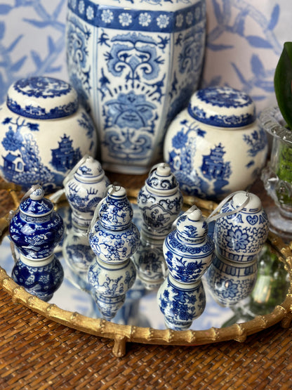 Danny’s Fine Porcelain- (6) Blue & White Chinoiserie Jars Porcelain Ornament Set, 3.5" Tall