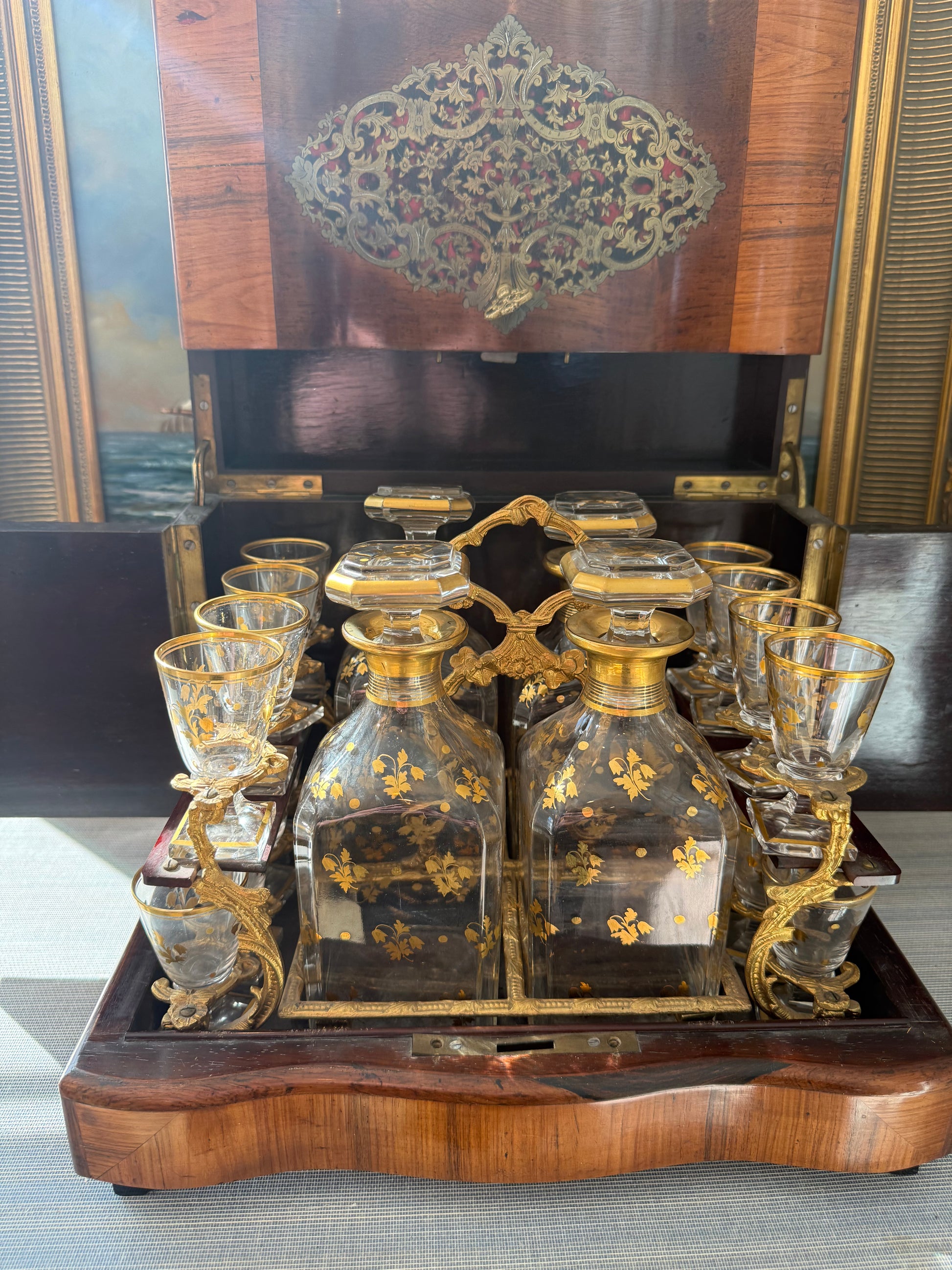 Reserved D (2) - Stunning Antique French Monogrammed Tantalus with 16 Cordials, 4 Decanters & Key