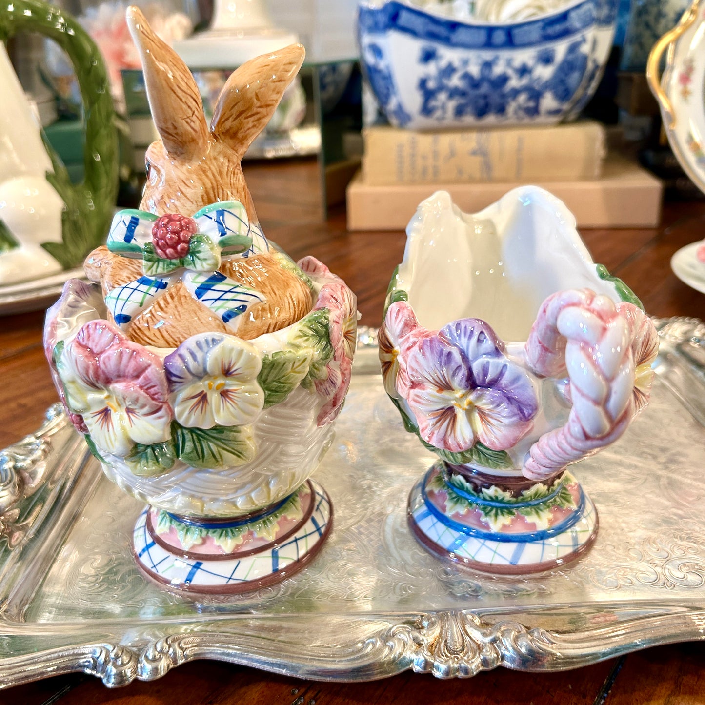 These whimsical Fitz & Floyd bunny rabbit cream and sugar holders come in a set of 2, measuring 5 x 4.5 inches. Each holder has a removable lid and is free of chips or cracks. Salt pepper and tray available too