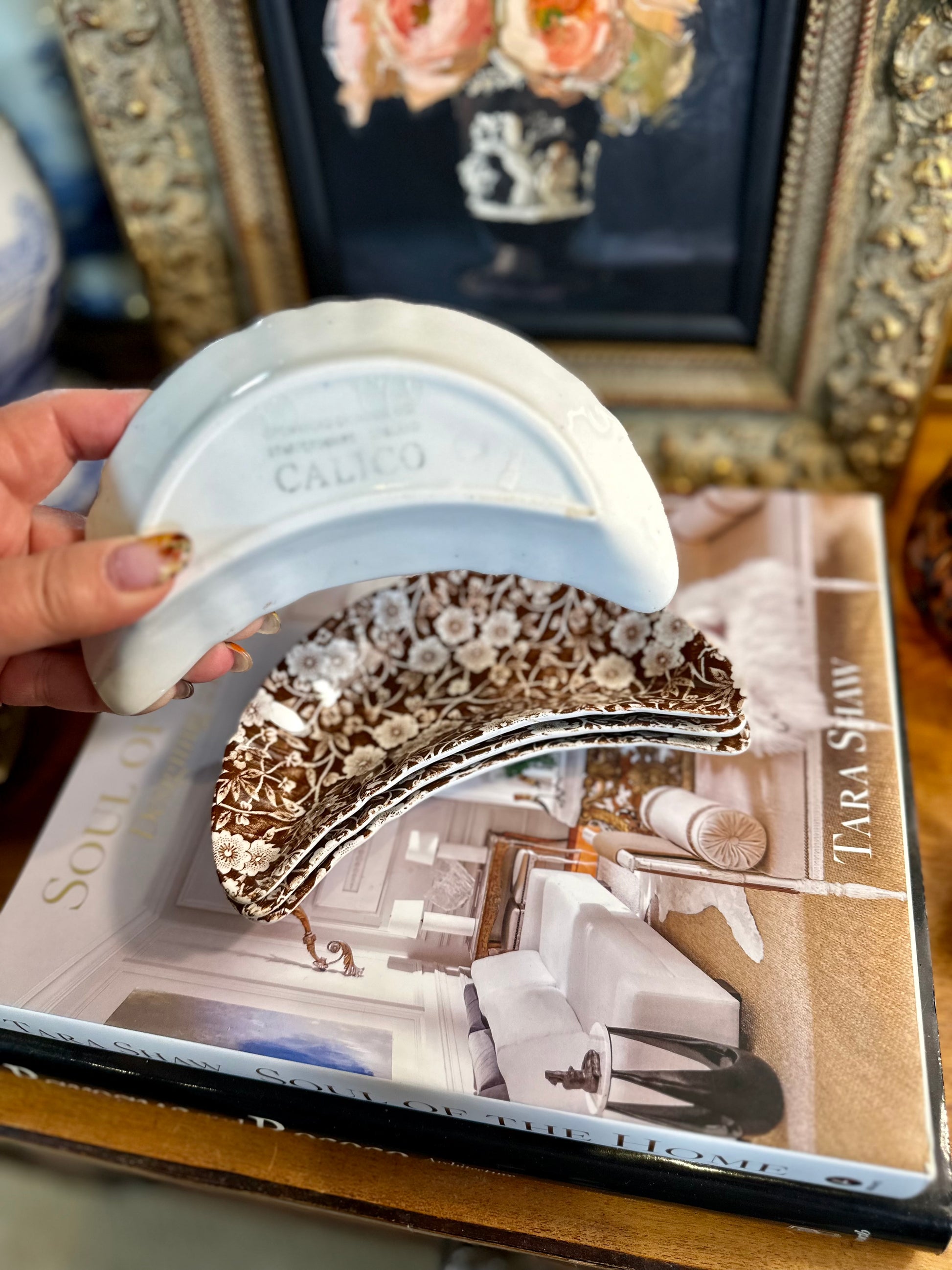 A fabulous set of 4 crescent shaped bone dishes in the brown Calico pattern by Crownford made in Staffordshire, England circa 1960. A classic calico pattern in brown and white florals. These are stamped on the back and make a perfect addition to a fall table. They're in excellent vintage condition with no chips or cracks.