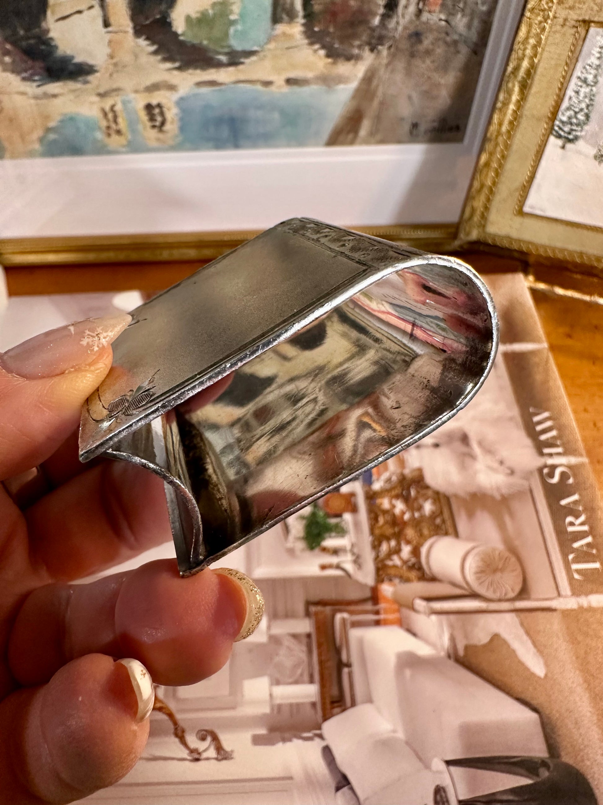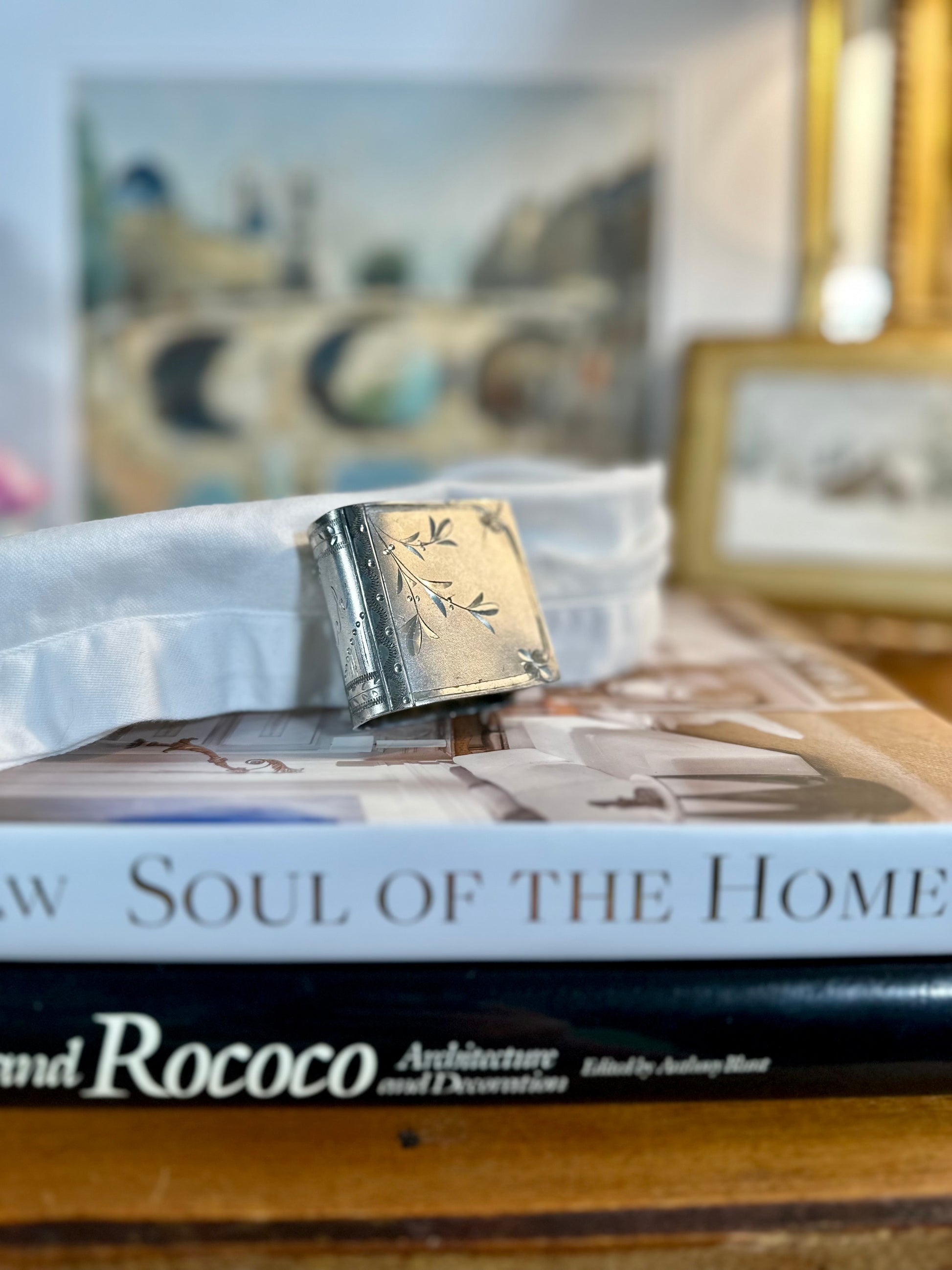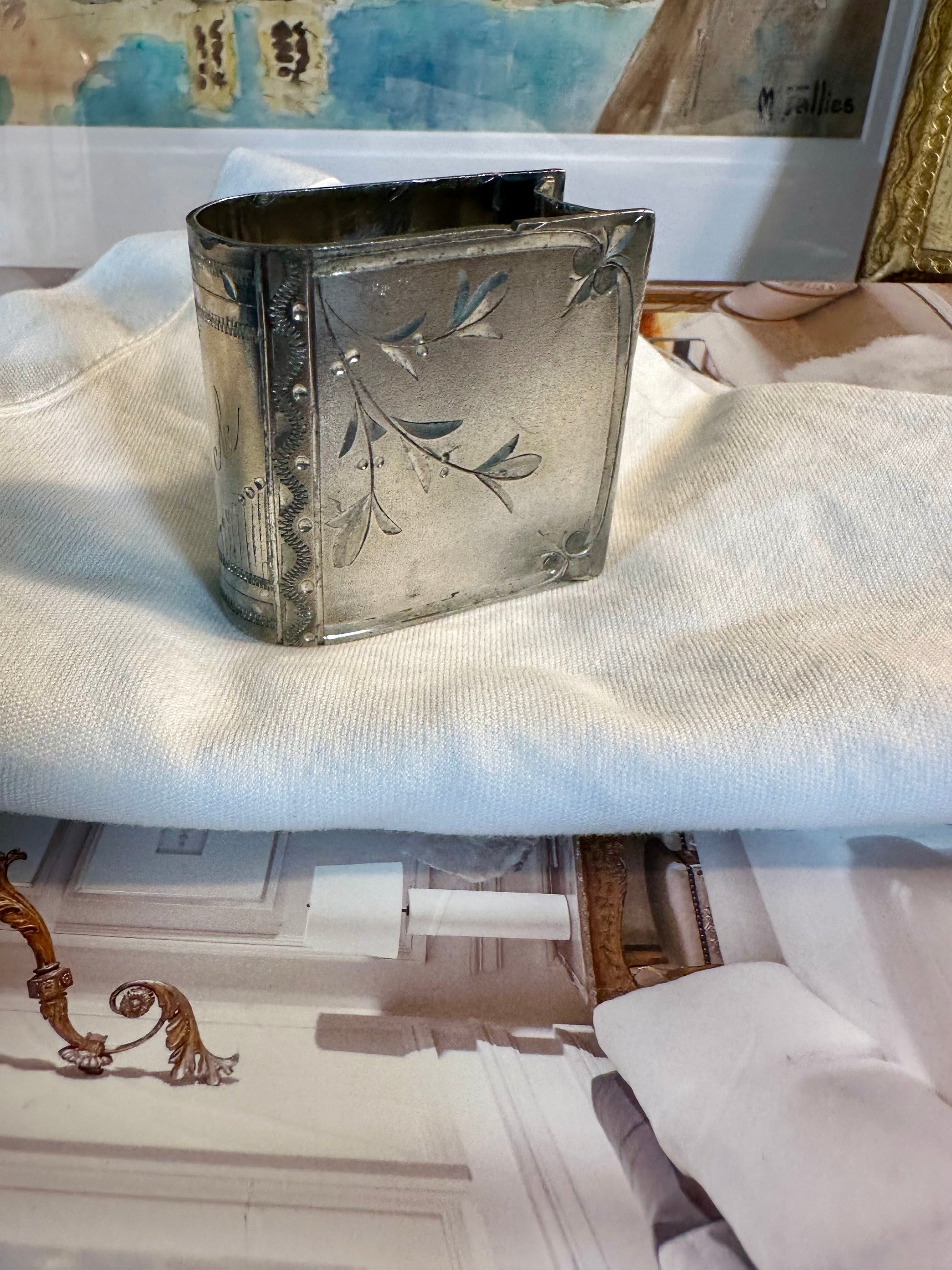 Vintage silver-plated figural napkin ring crafted in the shape of a book, beautifully accented with an etched floral design. A charming and collectible piece for antique lovers and those who appreciate a thoughtfully set table. The detailed book motif is engraved with the monogram “Jack” on the side, adding character and a sense of history that makes this piece truly one of a kind. Excellent vintage condition. Light surface wear consistent with age; no noticeable dents or damage.