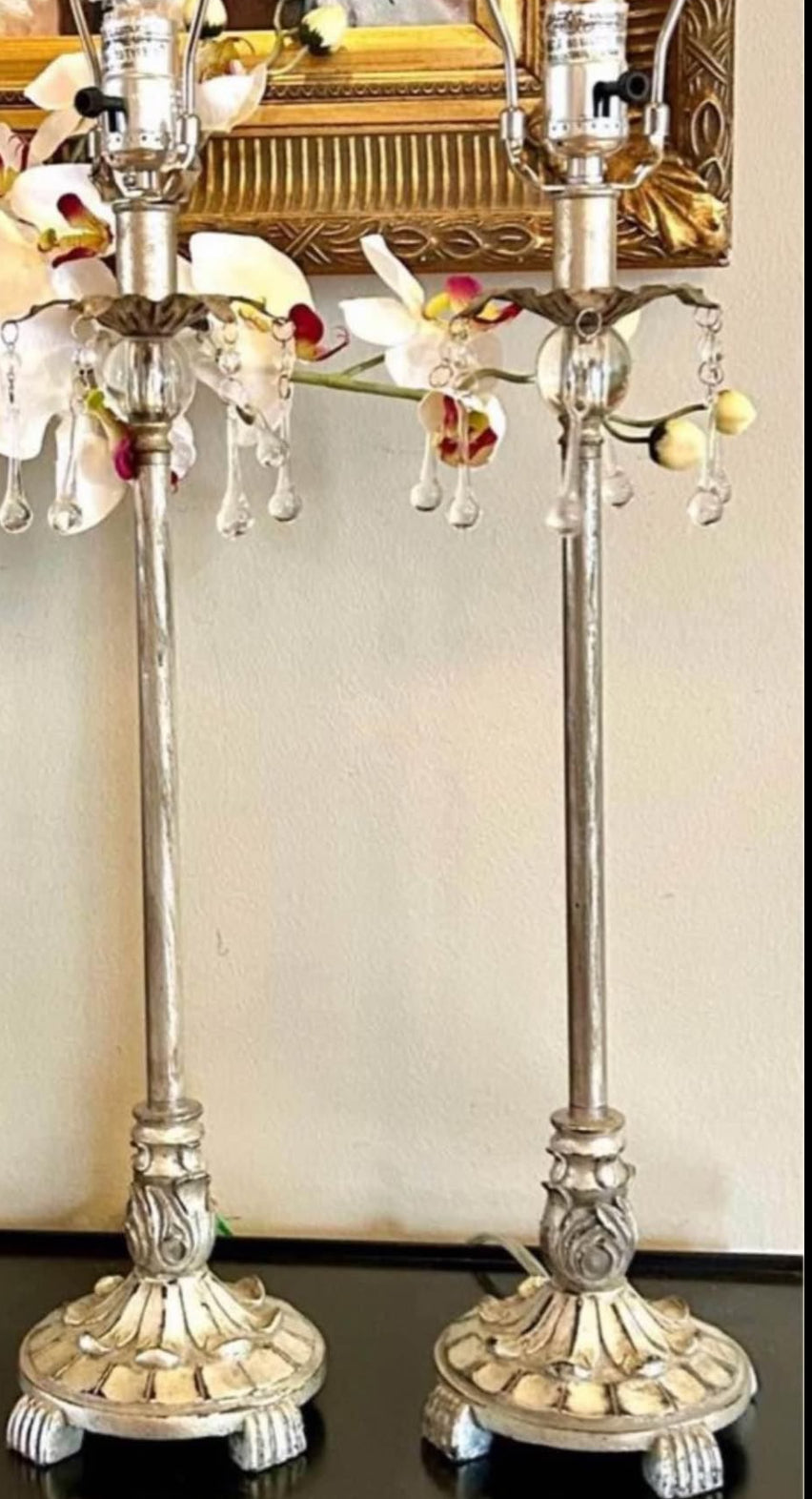 Elegant pair of vintage palm silver buffet lamps, exuding a statuesque presence. these 31 inch high lamps are the ultimate addition to your decor.