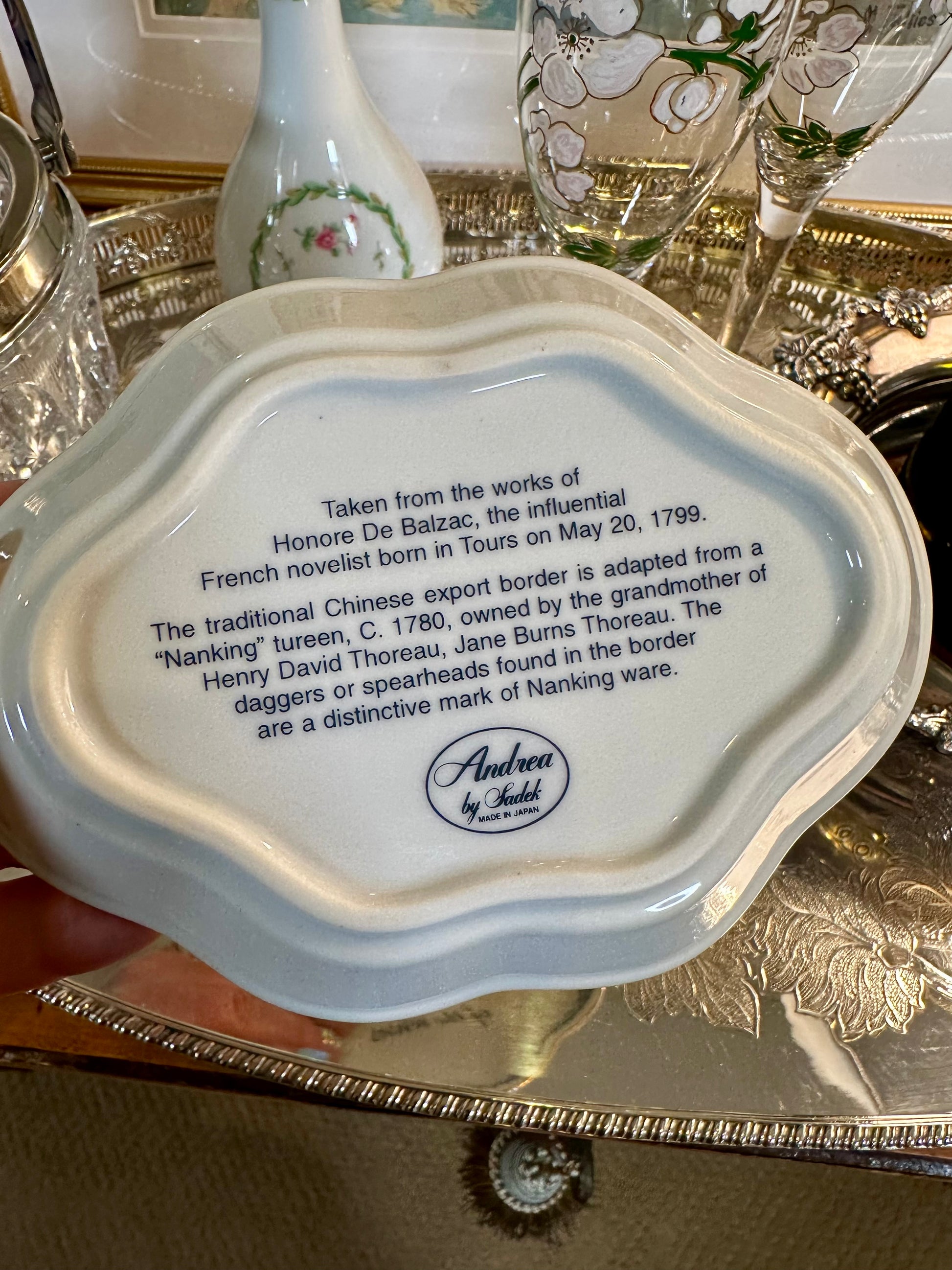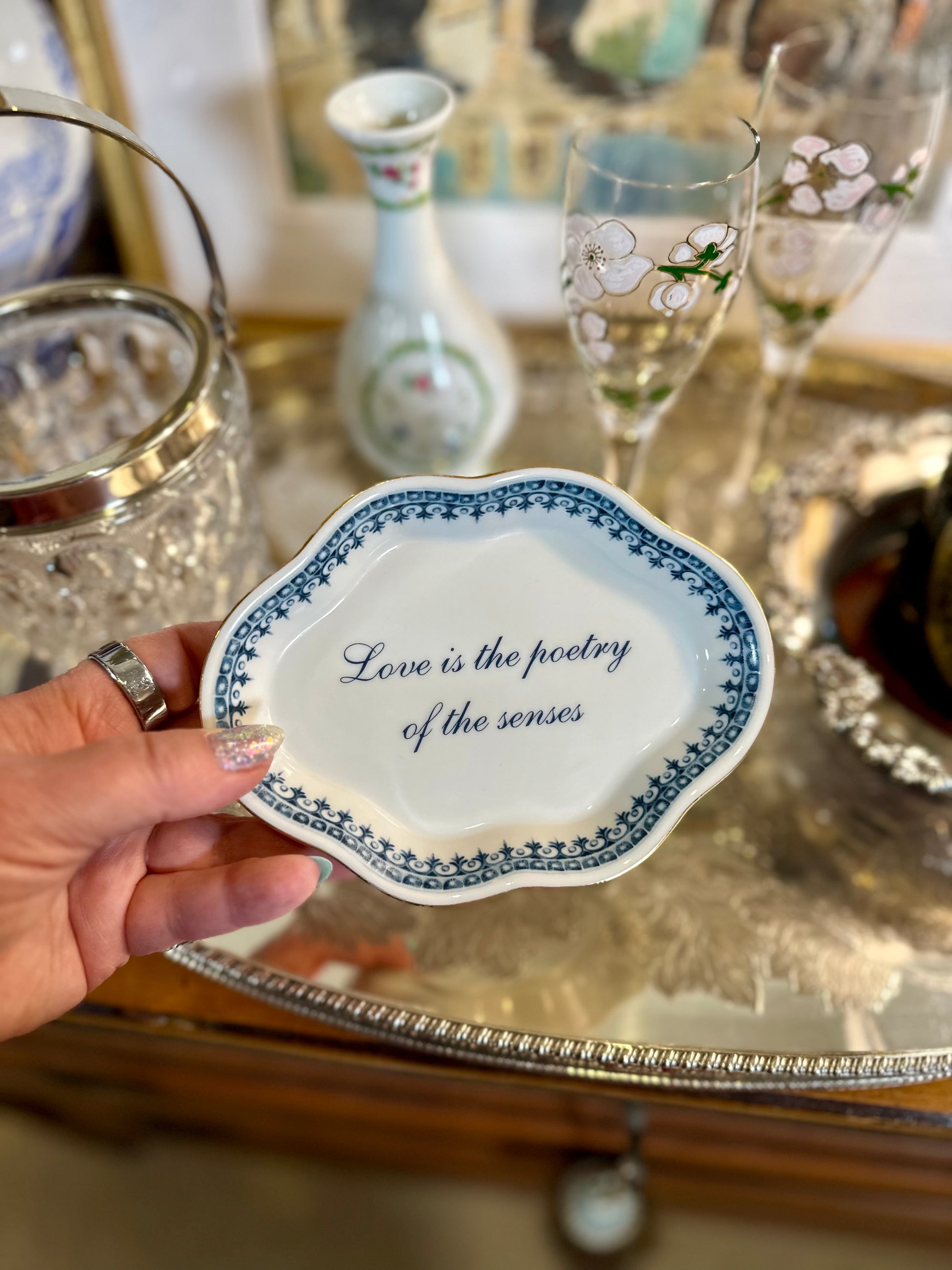 This charming vintage blue and white trinket dish by Andrea by Sadek features the romantic quote “Love is the poetry of the senses” by Honoré de Balzac. Part of the brand’s sought-after “Love” collection released in the 1980s, this piece was made in Japan and finished with a delicate gold-edged rim. Perfectly sized for holding rings, earrings, or other small treasures, it’s ideal for a bedside table, vanity, or desk. The dish is in excellent vintage condition with no chips or cracks and no loss to the gold gilding. A thoughtful and romantic gift—especially for Valentine’s Day—it pairs beautifully with champagne, chocolate-covered strawberries, flowers, and, of course, jewelry.