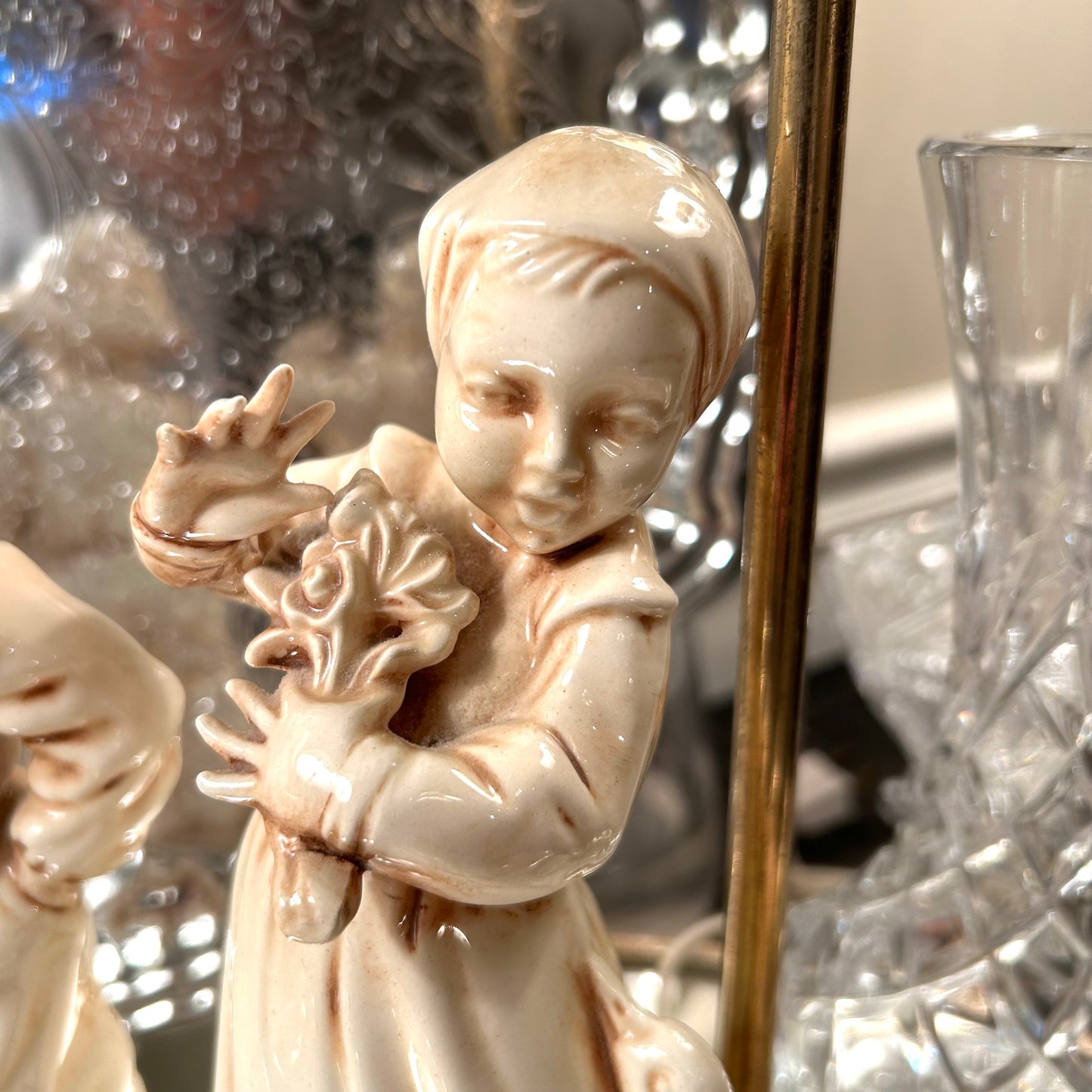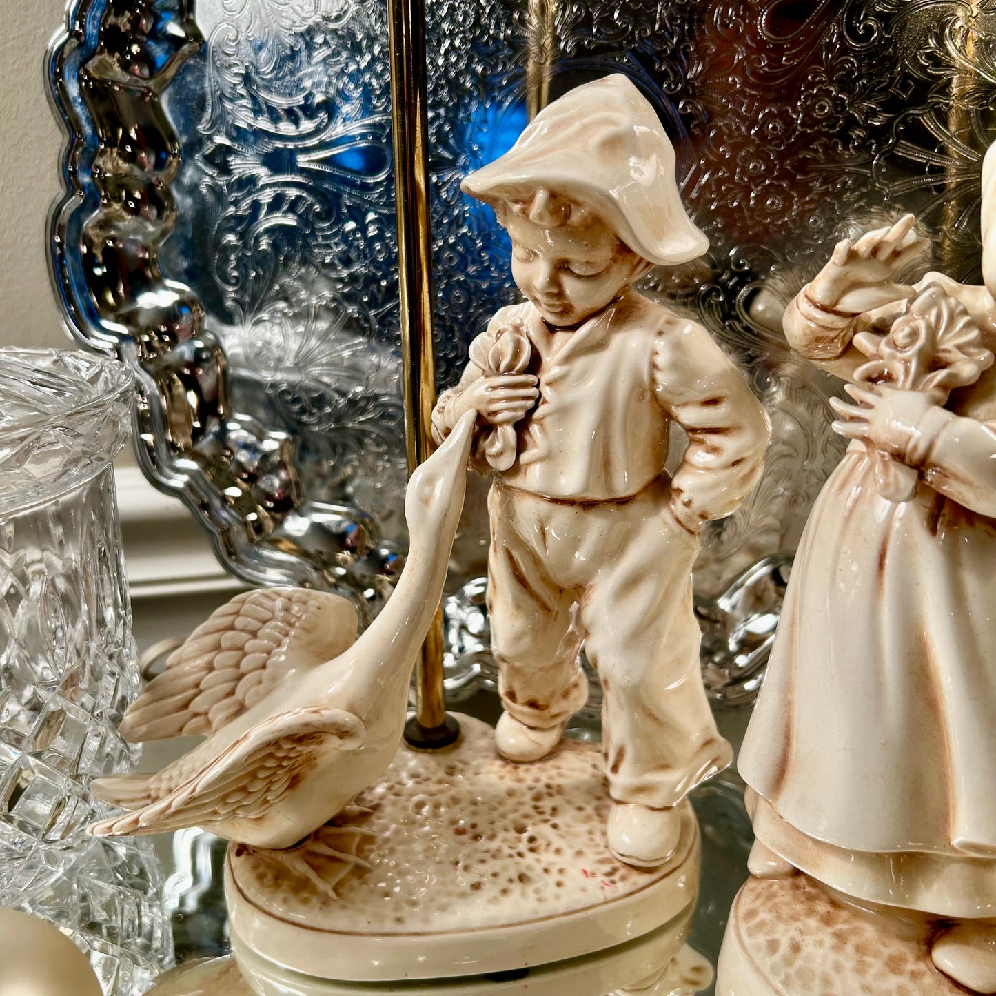 Whimsical pair of porcelain statue lamps girl & boy with their loving ducks