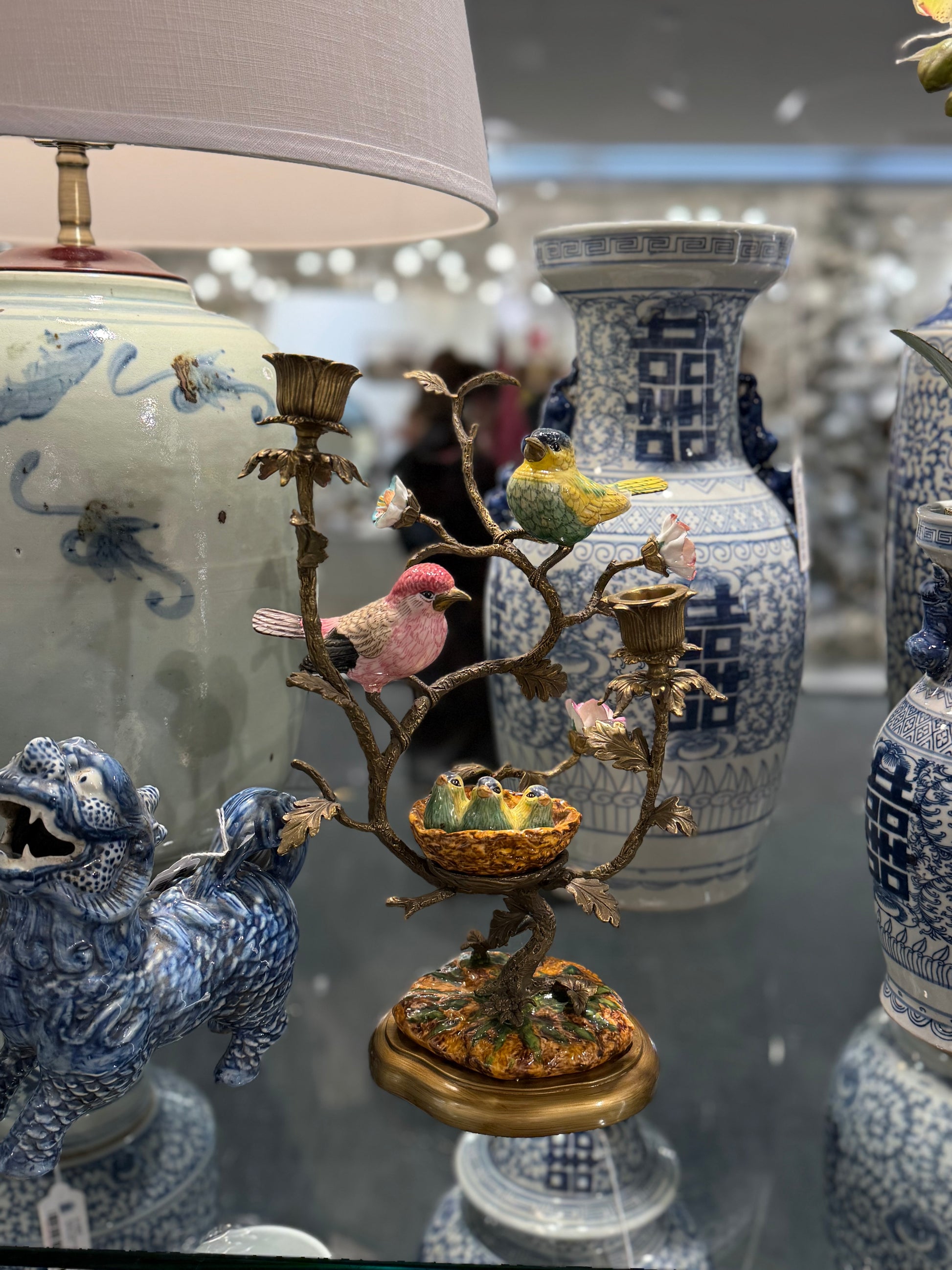 A captivating decorative statement from Danny’s Fine Porcelain, this bronze ormolu candlestick stand blends refined craftsmanship with whimsical charm. Designed as an elegant branching tree, the piece features hand-painted porcelain birds, delicate floral accents, and a charming nest of fledglings, celebrating nature through a classical European lens.