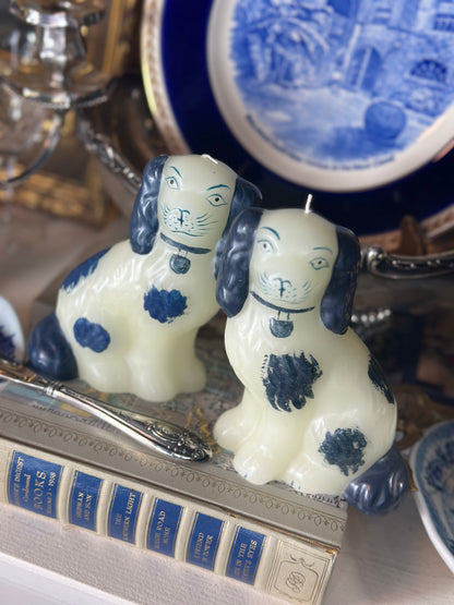Super adorable and sweet! We love this darling "Staffordshire" candle pair of pups in cobalt & White! Perfect to gift and comes in a ox. Candle Measures: 4Lx2Wx5.5"