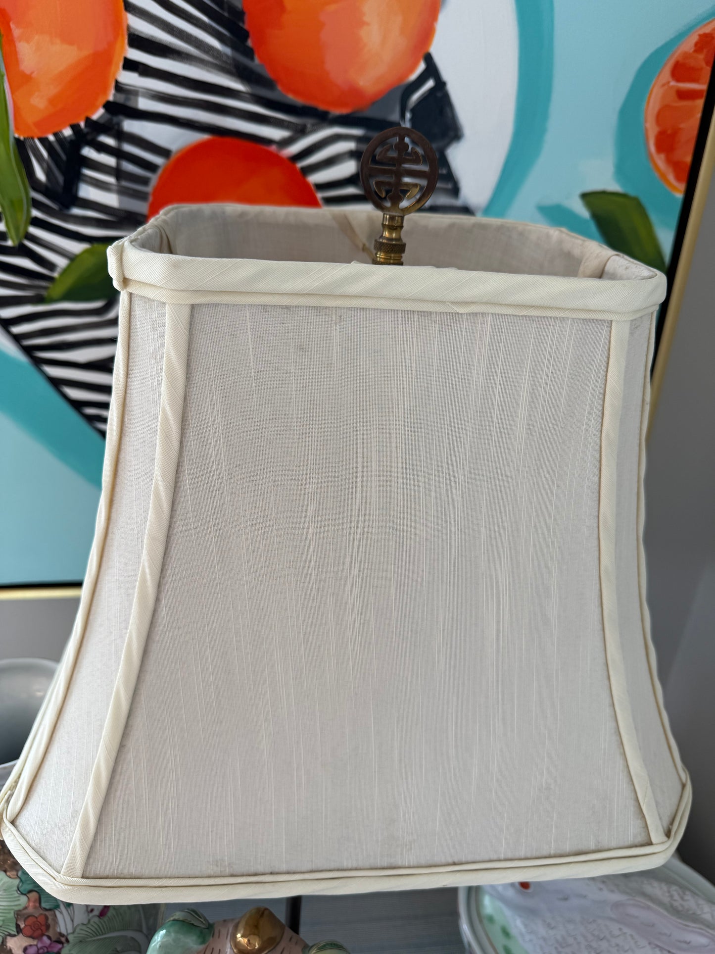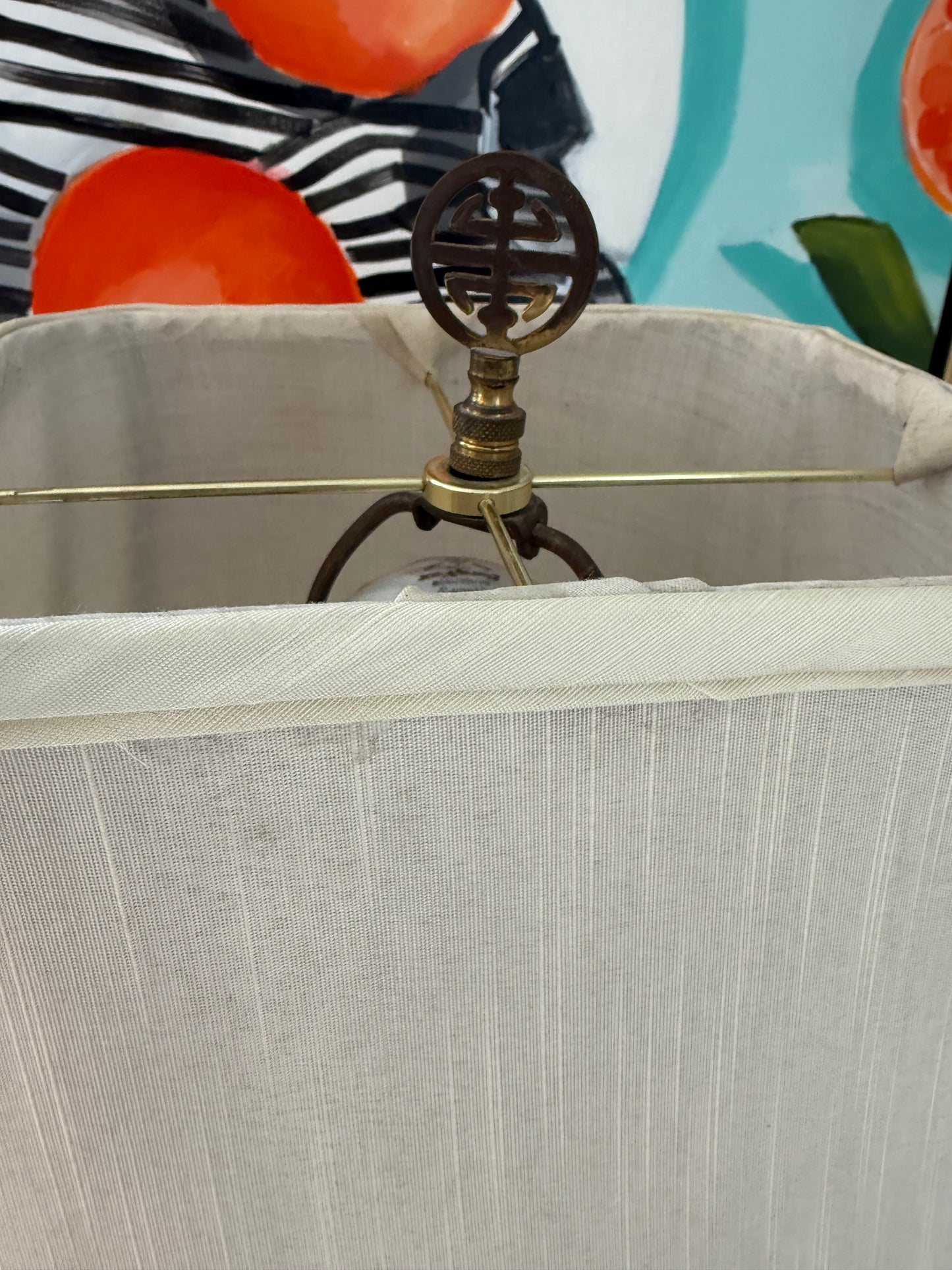It features a brass Chinese symbol finial and the shade is included and optional, but would ship separately. There is some staining to the lampshade.