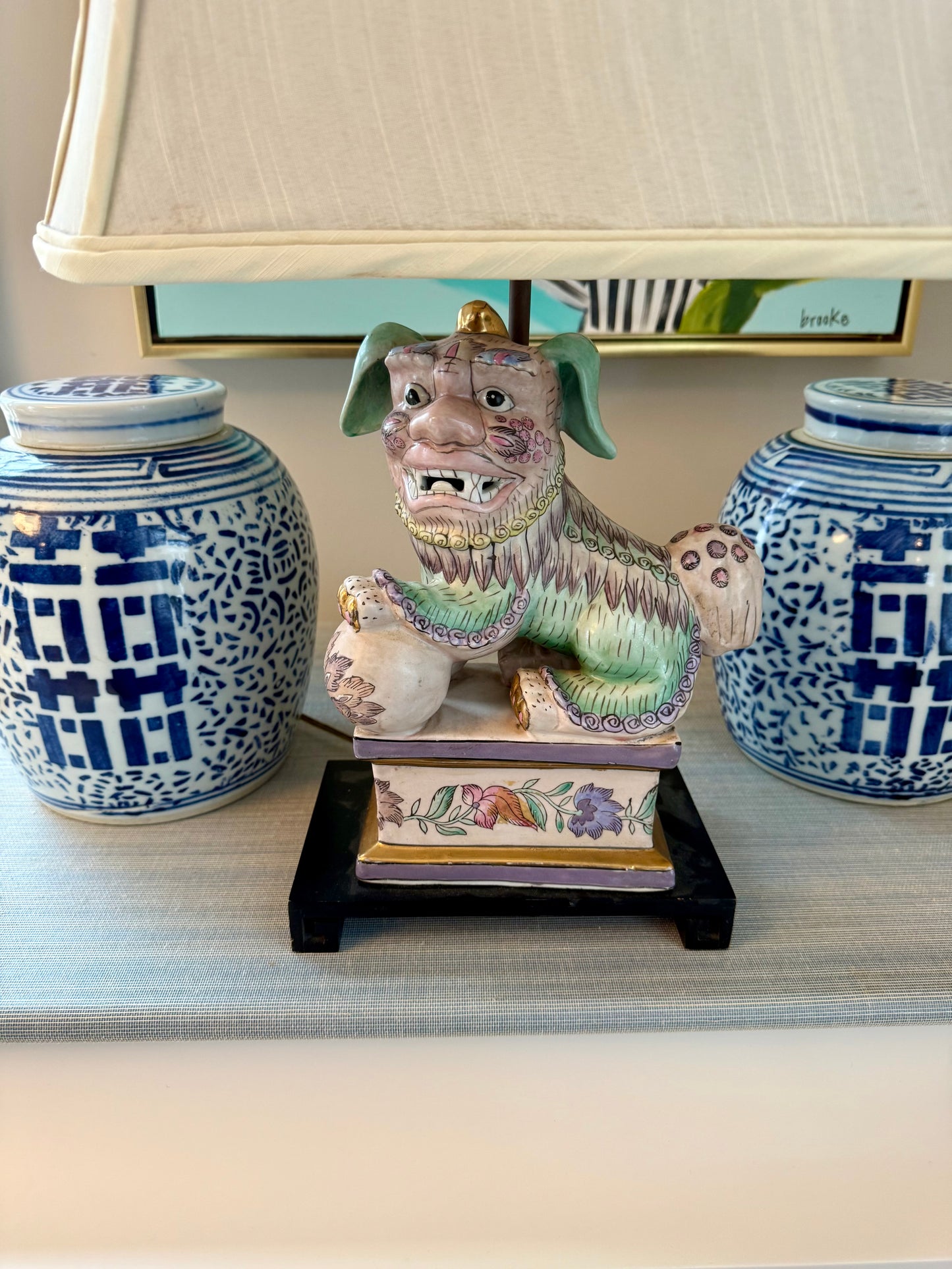 Absolutely stunning and hard to find hand-painted large foo dog lamp in a beautiful color way. Even the toenails are painted pink!!