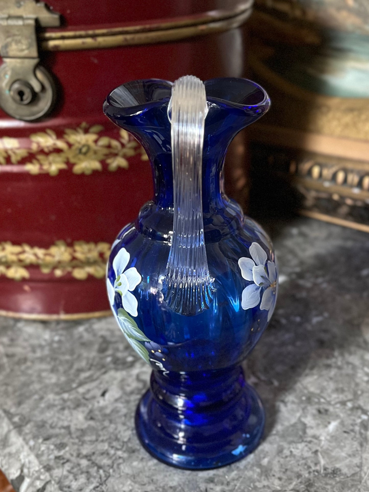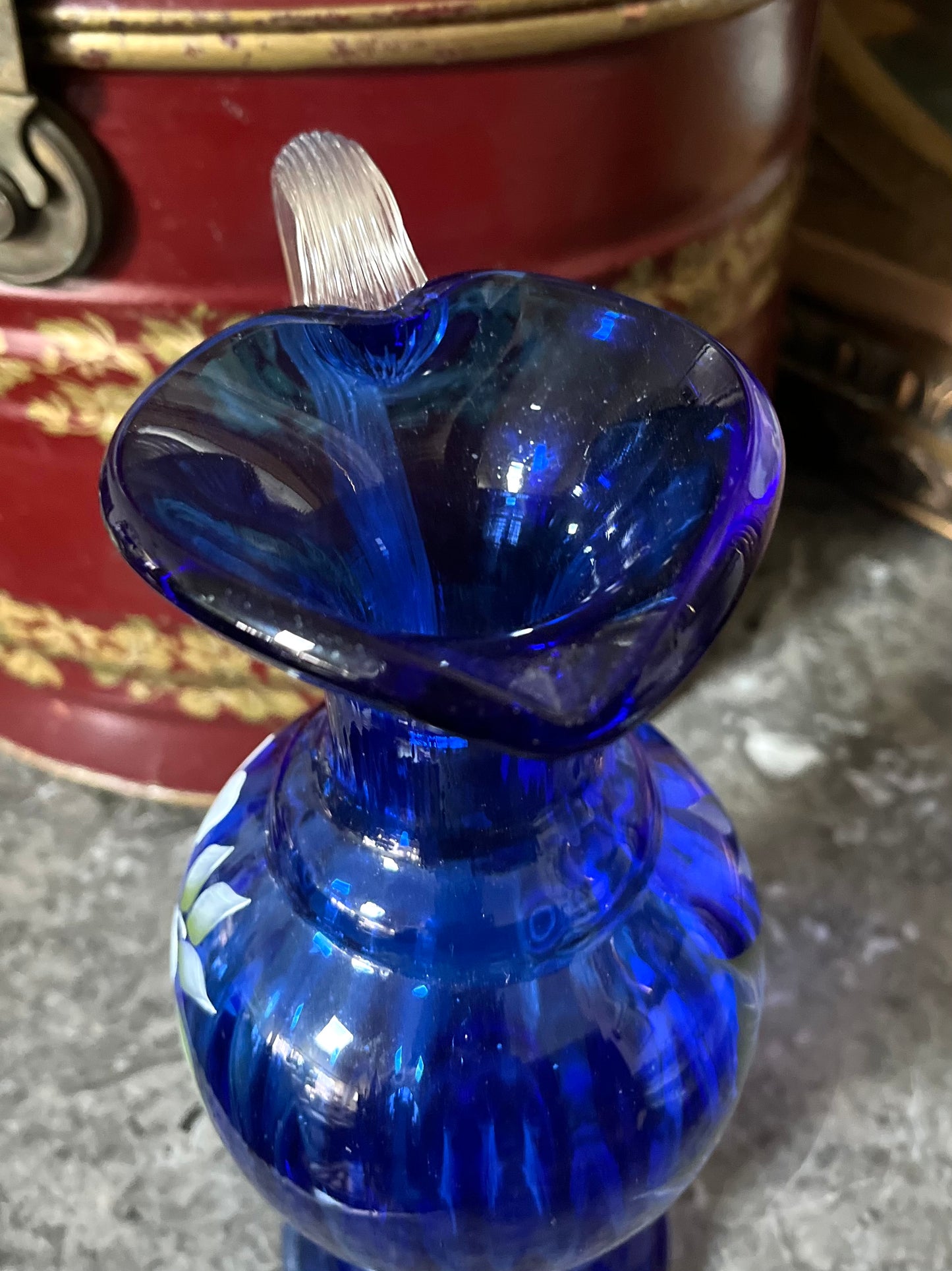 Fenton Cobalt Floral Glass Pitcher With Clear Striated Handle - Hand Painted/Signed