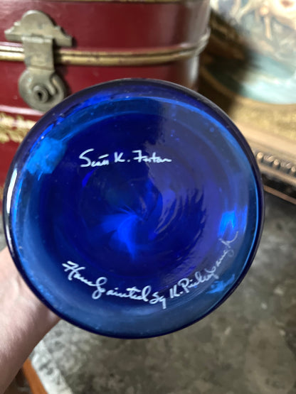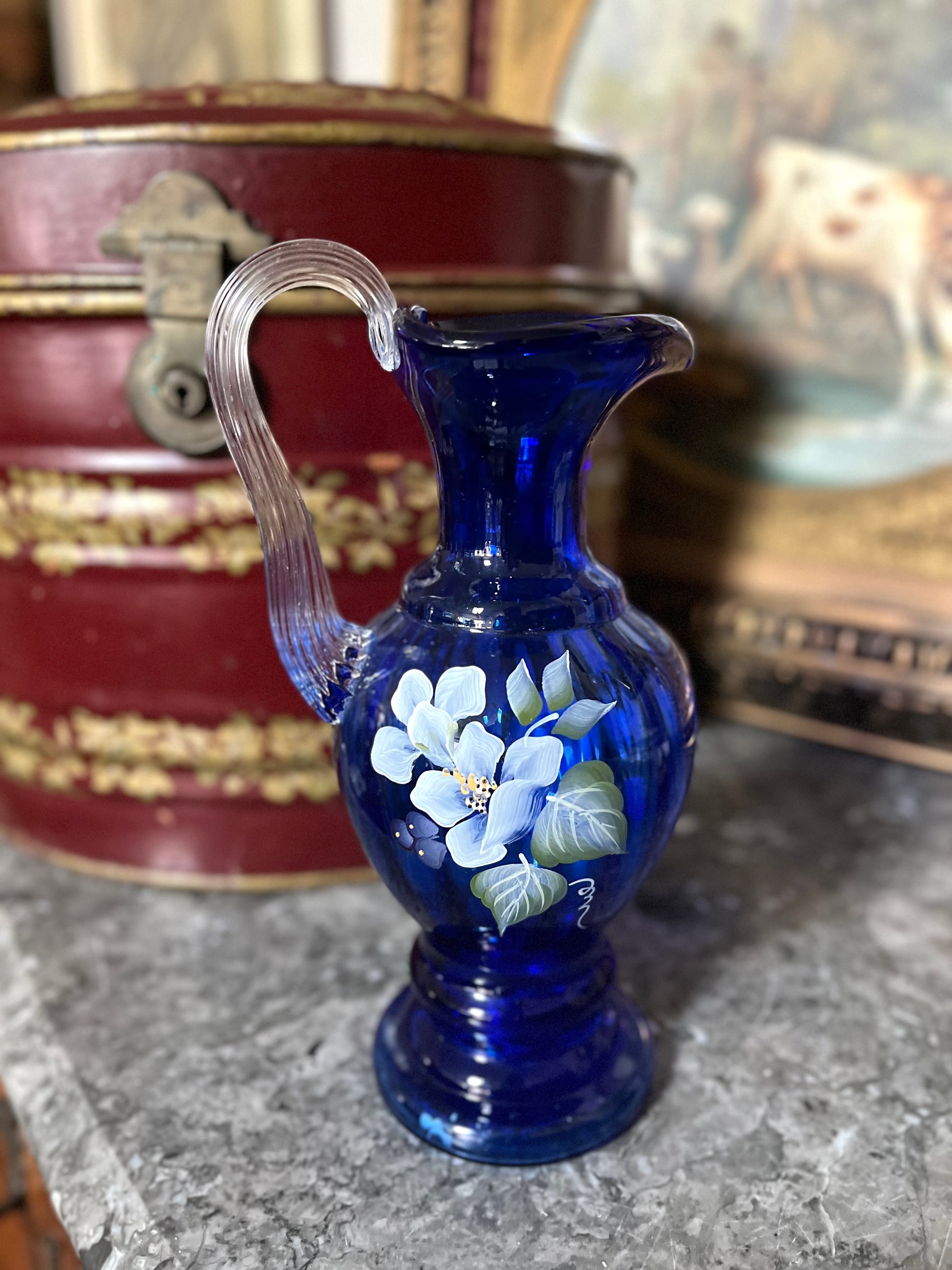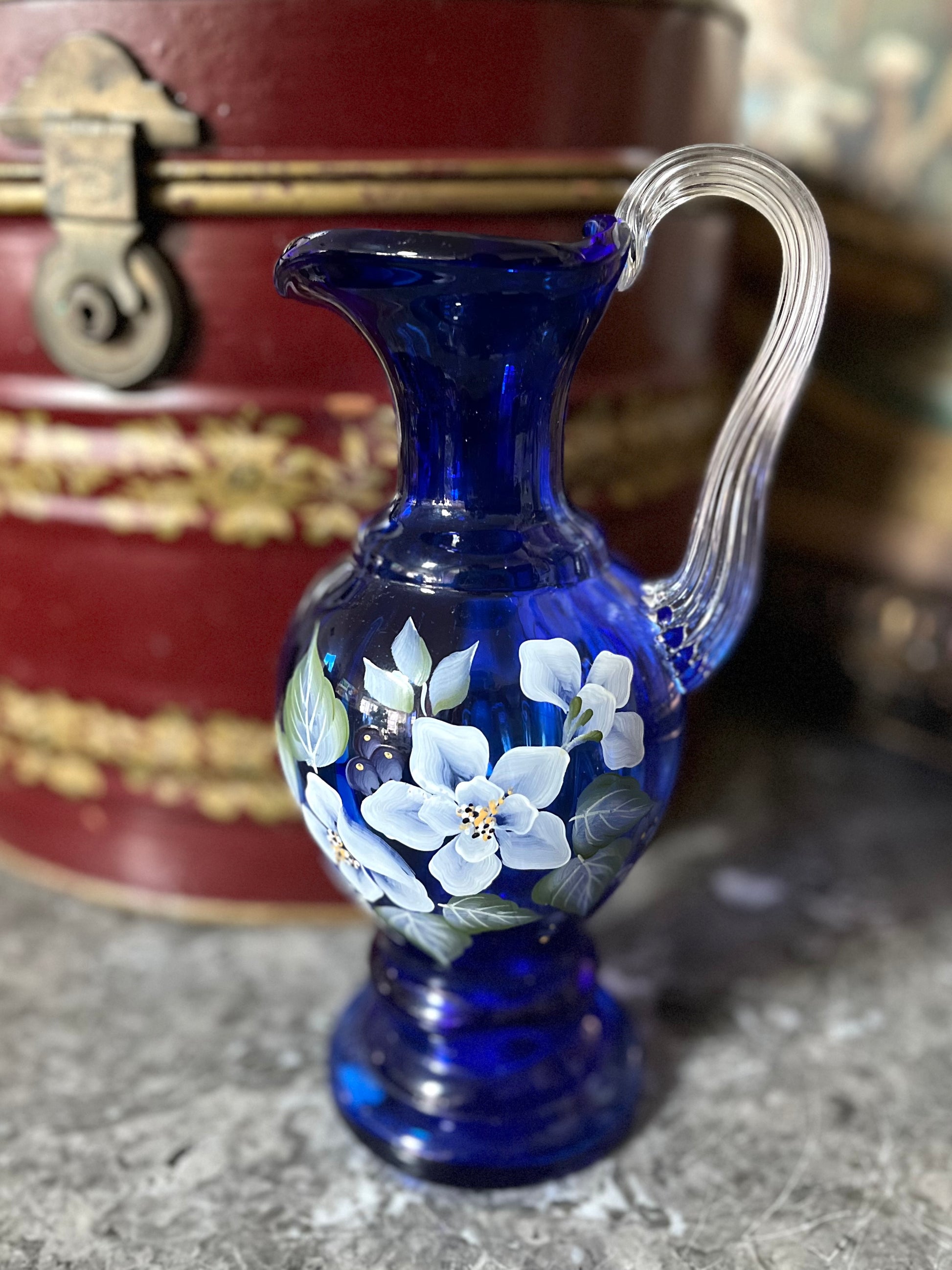 Elevate any space, with this Gorgeous Cobalt Hand Painted Fenton Pitcher. Adorned with stunning hand-painted florals and featuring a clear striated handle, this collectible signed glass piece will add a touch of elegance to any occasion. Brighten up your home with this exquisite and romantic pitcher today!