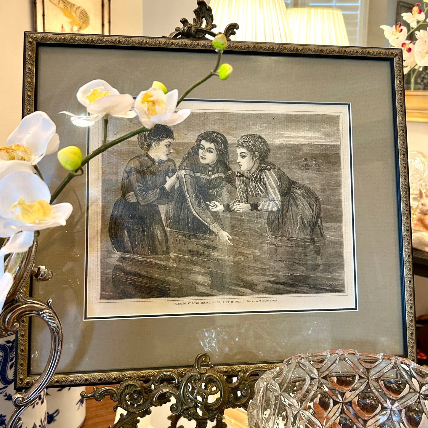 Lovely lithograph etching print Winslow Homer “Oh it Ain’t Cold” prof framed & mat 19x16 wall art