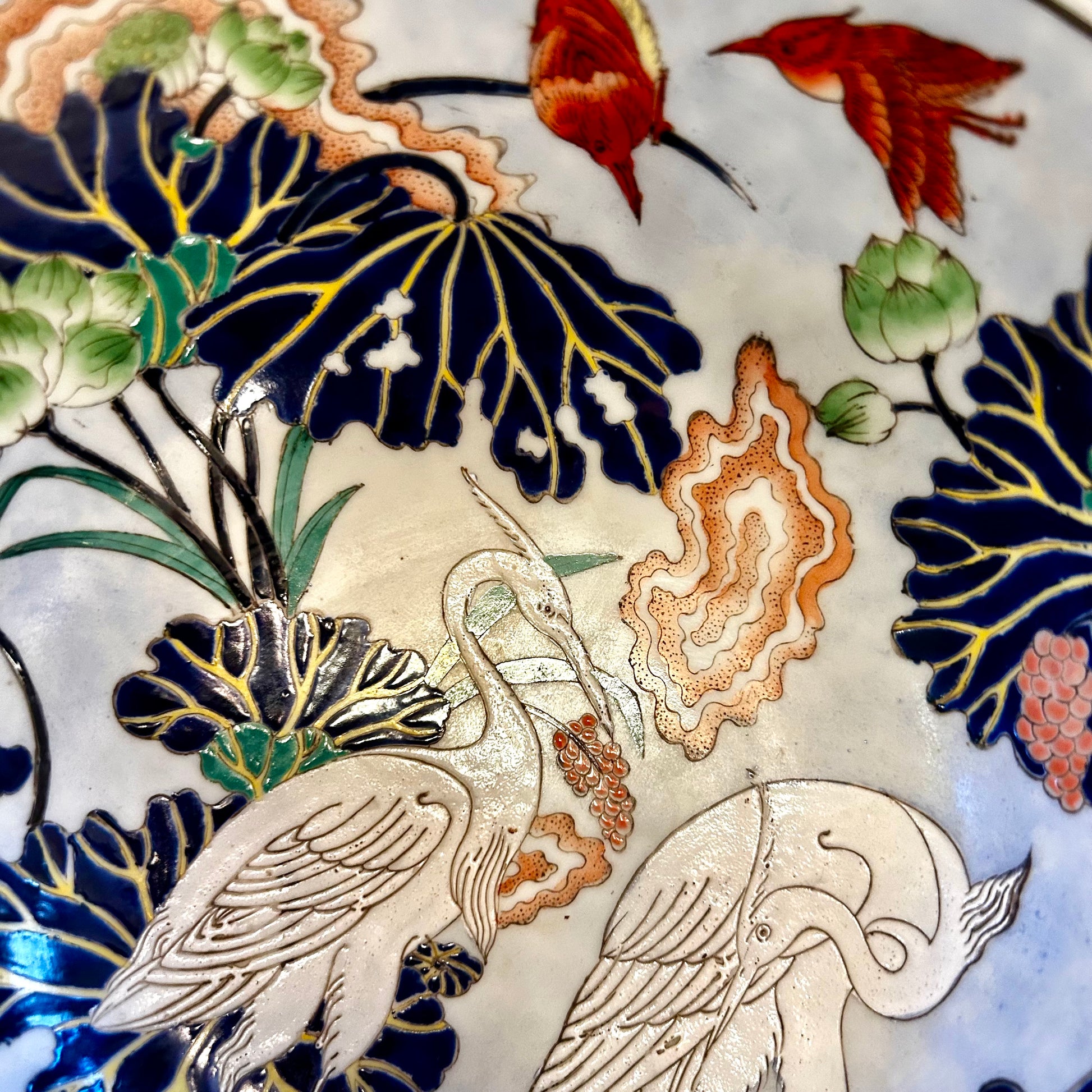 This Older vintage chinoiserie Chinese stamped bowl, originating from the mid 20th century, showcases a beautiful white Crane design highlighted with orange, cobalt blue, and white colors. The stamp of authenticity adds to its unique charm, price reflects a flea bite  With a diameter of 8 inches and a height of 4 inches, this bowl is a must-have for any vintage collector.
