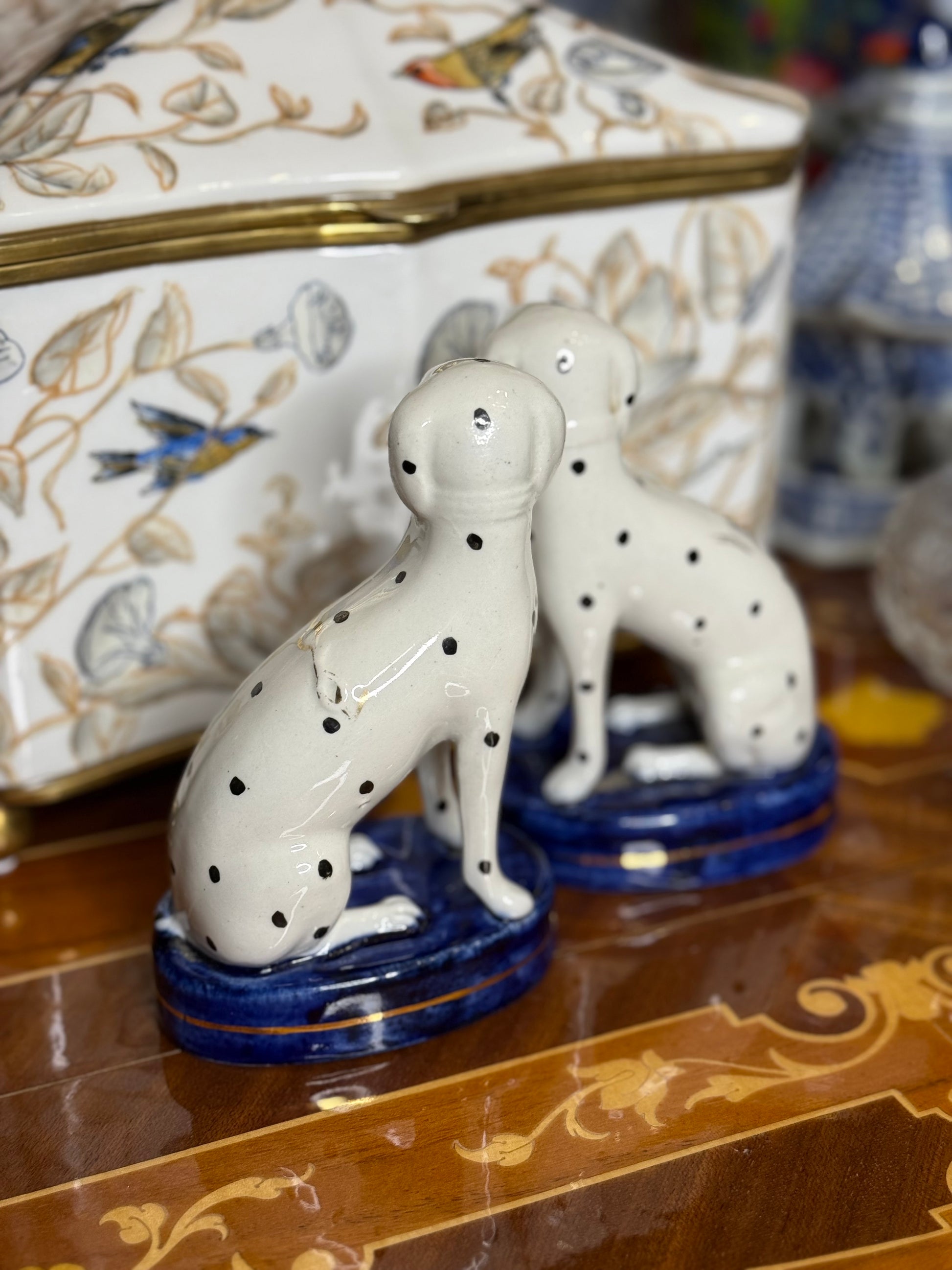 Bring a touch of English country house charm to your décor with this beautiful hand-painted pair of porcelain Dalmatian dogs. Inspired by classic 19th-century Staffordshire figures, each pup is finished in a gloss ivory glaze, detailed black spotting, and a gold-toned chain collar, all seated on deep cobalt blue plinth bases.
