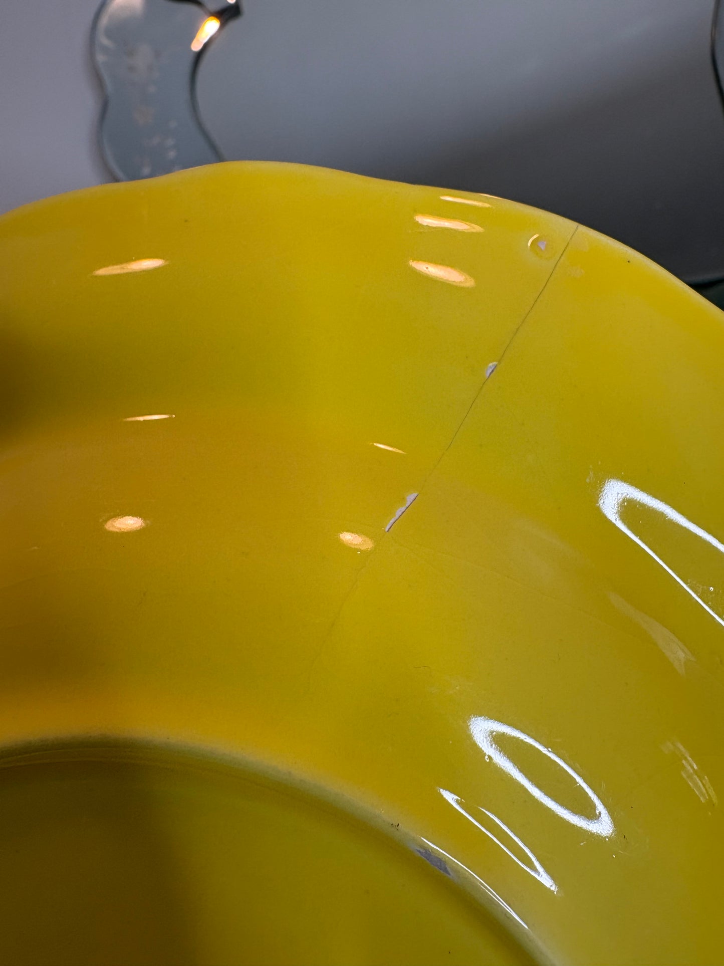 Experience the elegance and history of these French Faience Rimmed Soup Bowls in "Strausbourg Jaune" from Luneville. Each bowl measures 9.5" in diameter and is a stunning addition to any table setting. One bowl has a hairline crack, yet its beauty and charm remain intact. (See photo for reference). Embrace the unique character and craftsmanship of these beautiful bowls and add them to your collection today!
