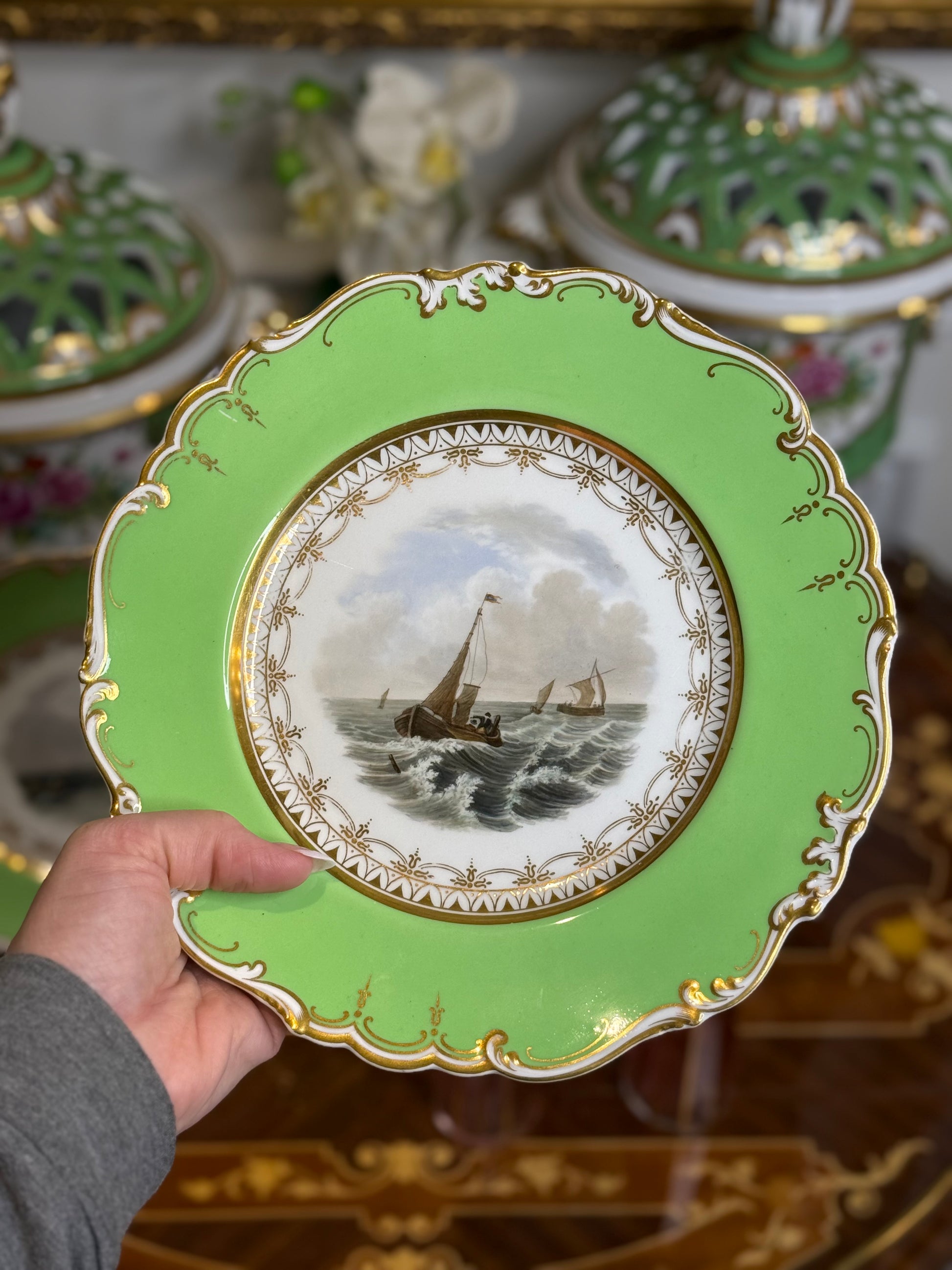 These plates have wonderful presence and make a striking decorative pair for wall display, open shelving, or styling in a cabinet. The rich green ground paired with the delicate seascapes offers a timeless English aesthetic that works beautifully in both traditional and collected interiors.