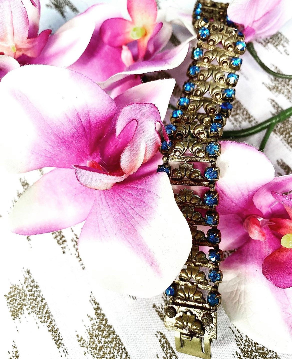 Experience the timeless elegance of our Stunning Antique 1920’s Art Nouveau Box Link London Blue/Brass Bracelet. Adorned with breathtaking London blue rhinestones, each intricate link boasts exquisite detail. This bracelet is in excellent antique condition and features a secure clasp. Elevate any outfit with this piece of antique beauty.