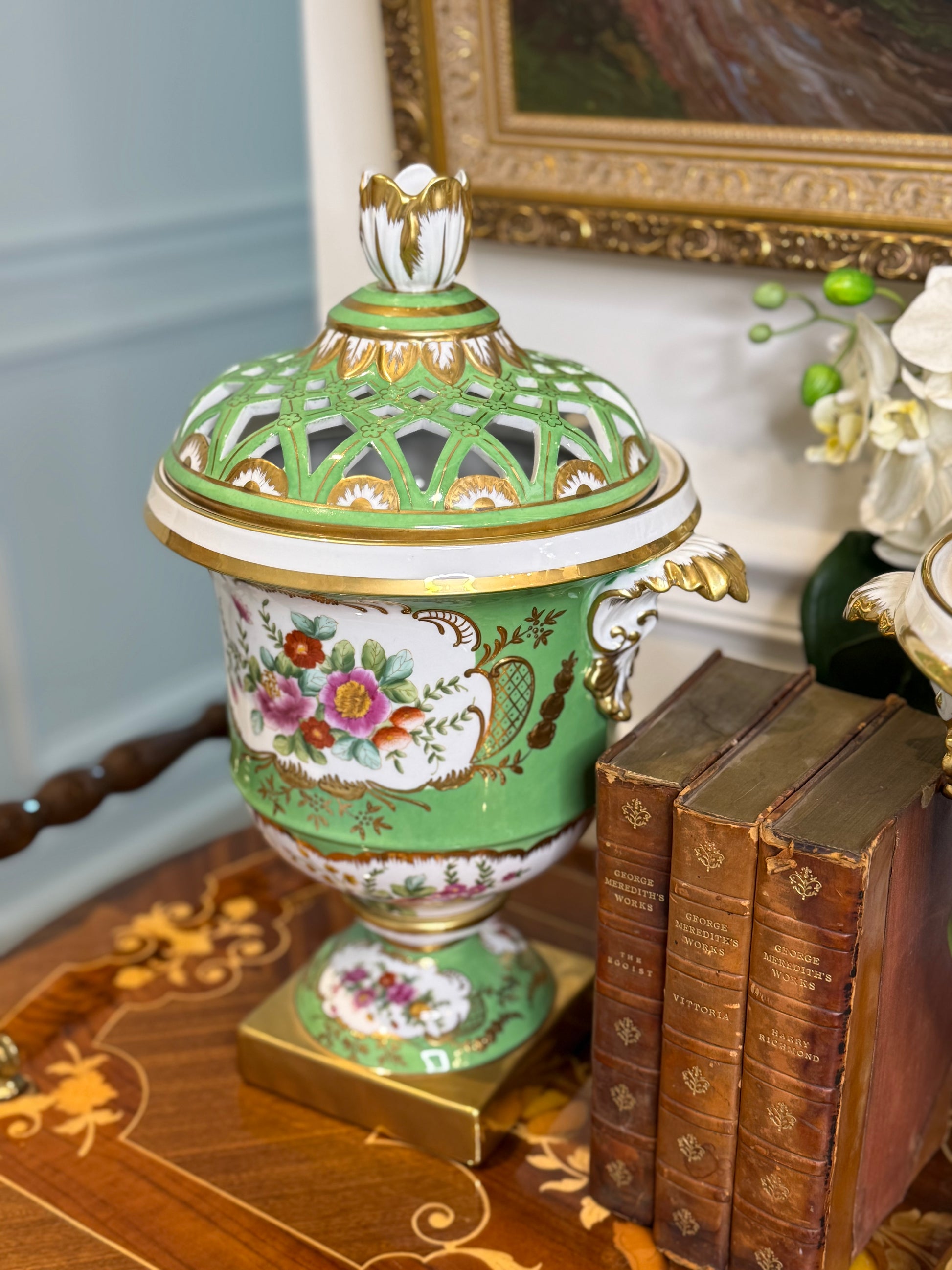 STUNNING - 16” Tall, Chelsea House Green Lattice Porcelain Urn Pair with Domed Covers & Finials