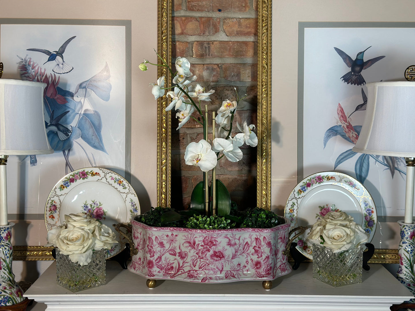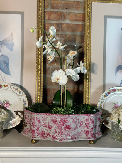 Gorgeous as a centerpiece on your table or buffet! Beautiful, this planter is perfect for sprucing up any outdoor or indoor space. It encompasses a unique combination of classic style and modern convenience. Bring the beauty of nature indoors with this gorgeous NEW "Primrose" basin planter. Hand-crafted from white and pink porcelain with bronze ormolu detailing, this 22"L x 11"W x 7"H planter is a stunning centerpiece for your table or buffet. Dare to be different and enjoy the fragrant beauty of lush flowers or greenery inside your home! Measures large at 22"L X 11"W X 7H (Open 17L X 11W) Stunning Porcelain Planter With Bronze Ormolu detailing in a Pink/white "Primrose" pattern