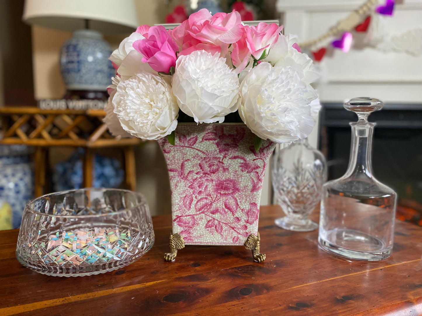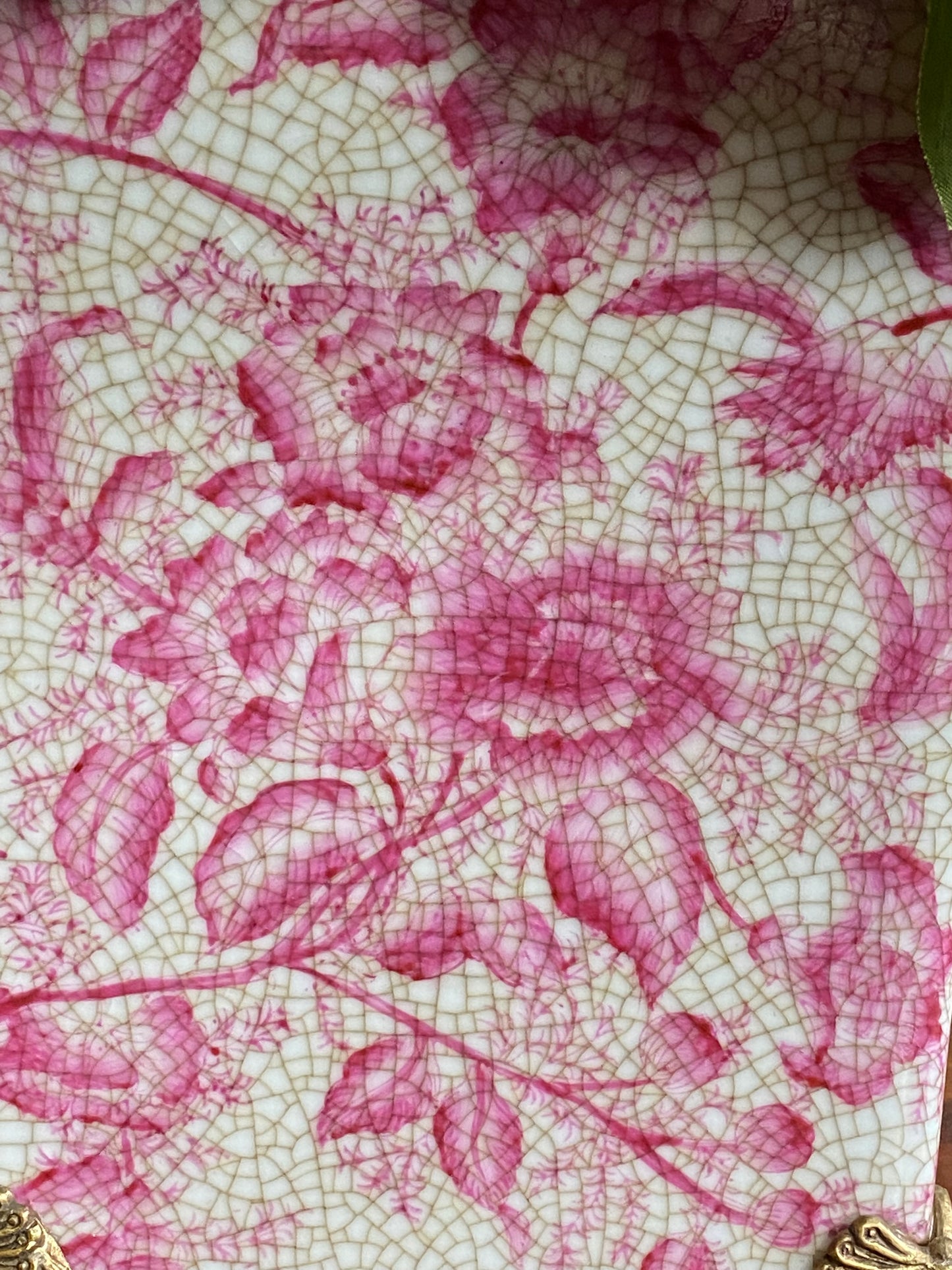 Danny's Fine Porcelain - Pink/White “Prim Rose” Bronze Footed Square Vase Planter - 8.5x6.5"