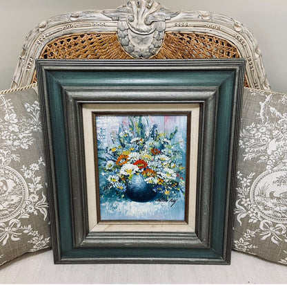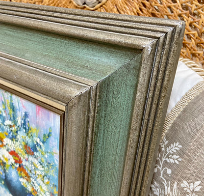 This vintage signed original oil painting by artist Hellen Post features a sunny color palette and comes framed in wood. Measuring 18 x 16 inches, it is a beautiful piece.