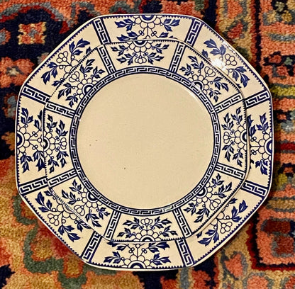Set of 7 John Haddock blue and white Greek key older dinner and salad plates