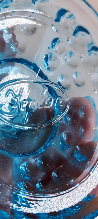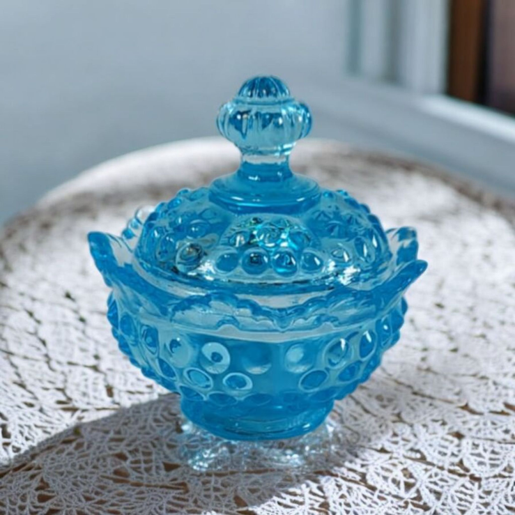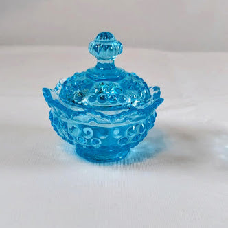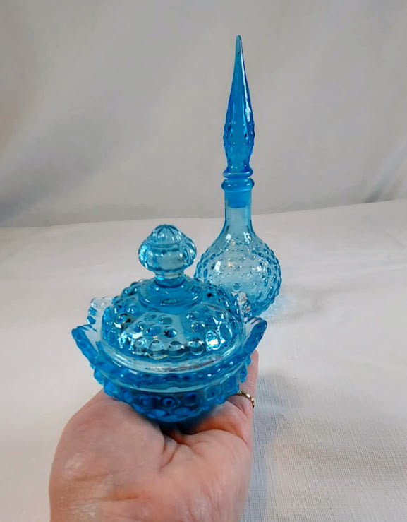 This beautiful vintage aqua blue hobnail lidded bowl and genie bottle are expertly crafted with delicate hobnail glass. Made by Fenton Glass, the bowl comes with a lid for added functionality. The maker of the genie bottle is unknown. A stunning addition to any collection. The bowl with lid is in perfect condition. *****The genie bottle has a sliver off the tip. Measurements are: Genie Bottle is 7 1/2" tall and the Fenton Trinket bowl is 4 1/4" across and 3 1/2" tall with the lid.