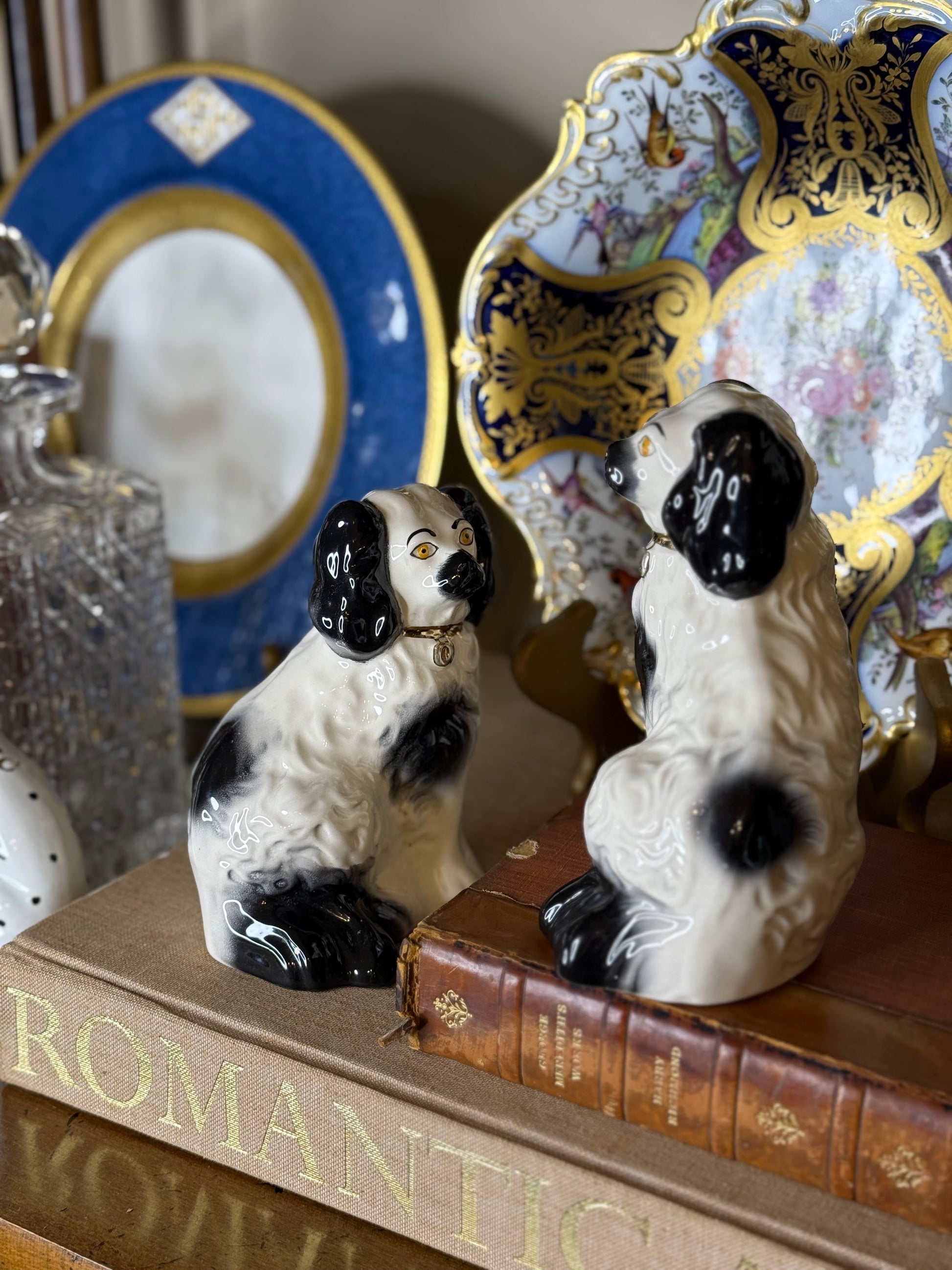 A charming matched pair of vintage Beswick England porcelain spaniel figurines, beautifully modeled and hand-painted with expressive detail. Each dog features the classic black and white coat, bright amber eyes, and a delicate gilt collar—hallmarks of Beswick’s highly regarded mid-century animal figures.