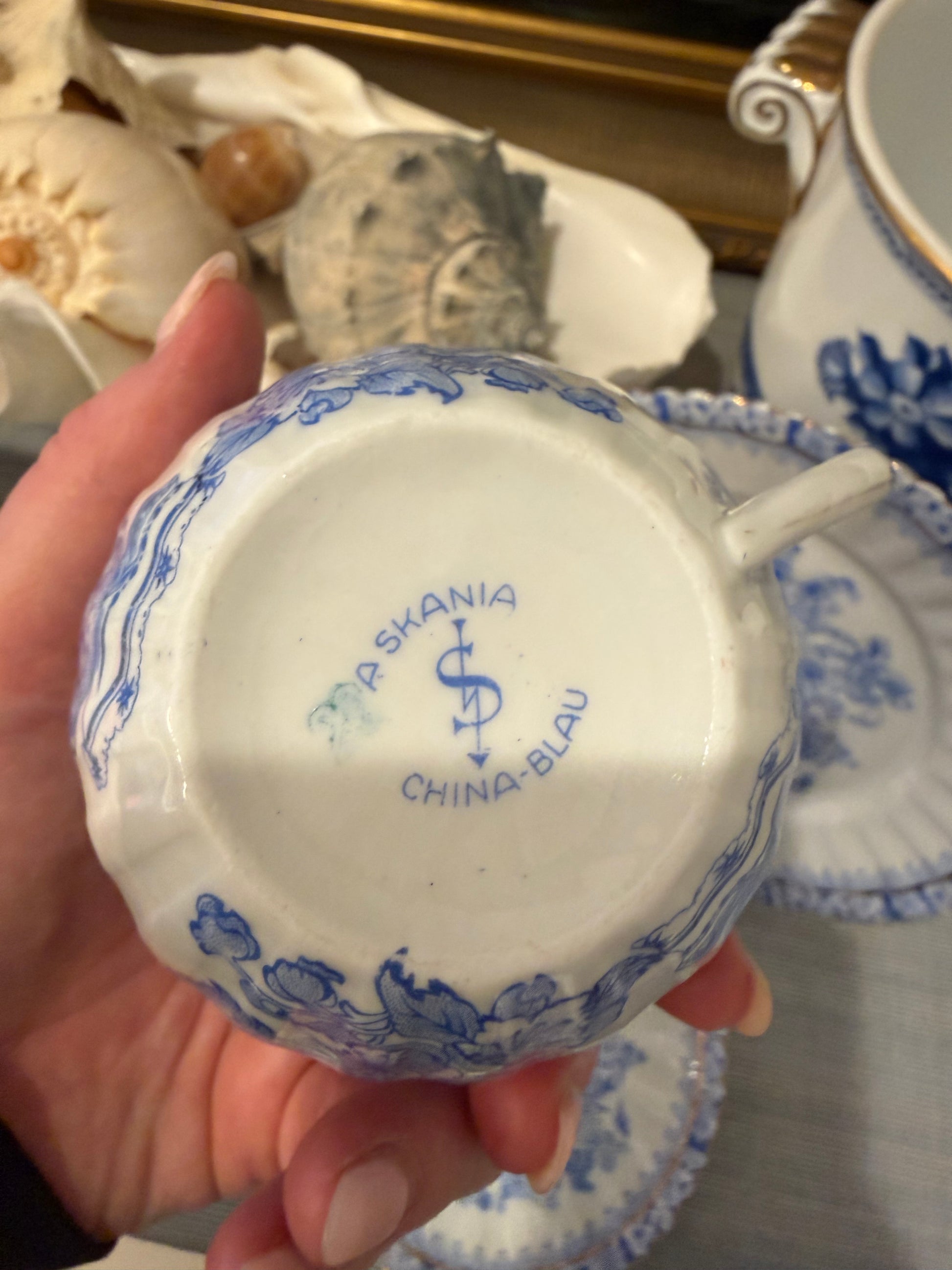 Gorgeous dessert set for 2! Includes 2 dessert plates measuring 7.5”, 2 saucers measuring 5.75”, & 2 tea cups measuring 4.5”. Marked ‘Askania China-Blau’ on the bottom. Excellent condition, no chips or cracks.