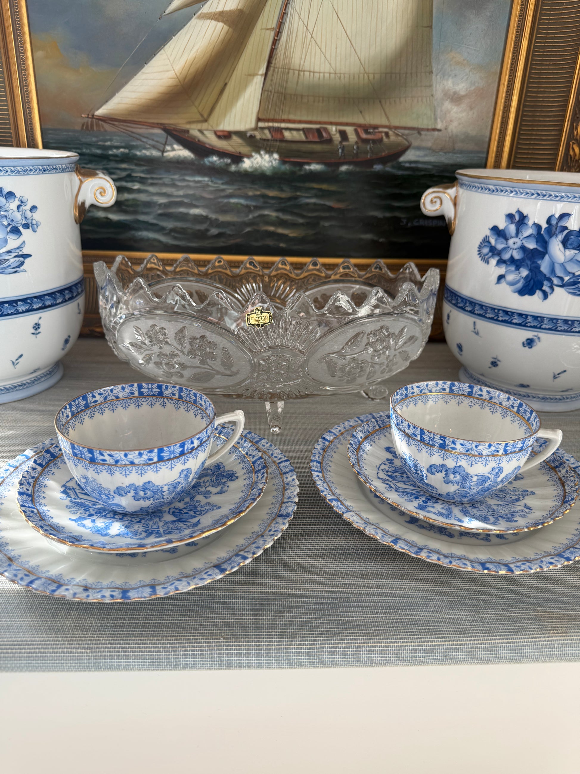 Vintage Blue & White Porcelain Set for 2 - Pair of Teacups, Saucers & Dessert Plates