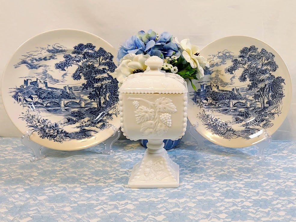 Upgrade your tableware with these Vintage Enoch Wedgwood “Countryside” plates, featuring a classic blue and white transferware design. Made in England, this set of 4 plates measures 10" and is free of chips, cracks, and repairs. Elevate your dining experience with these high-quality, timeless pieces.