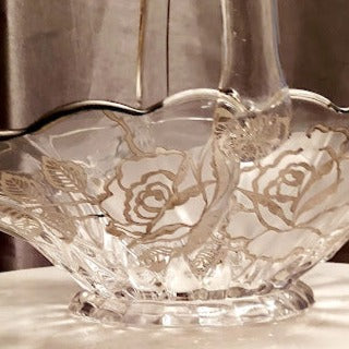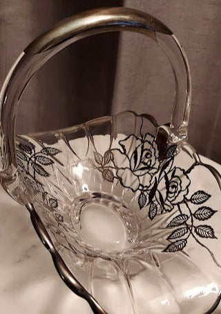 Vintage glass bridal basket with silver overlay, beautiful Rose design